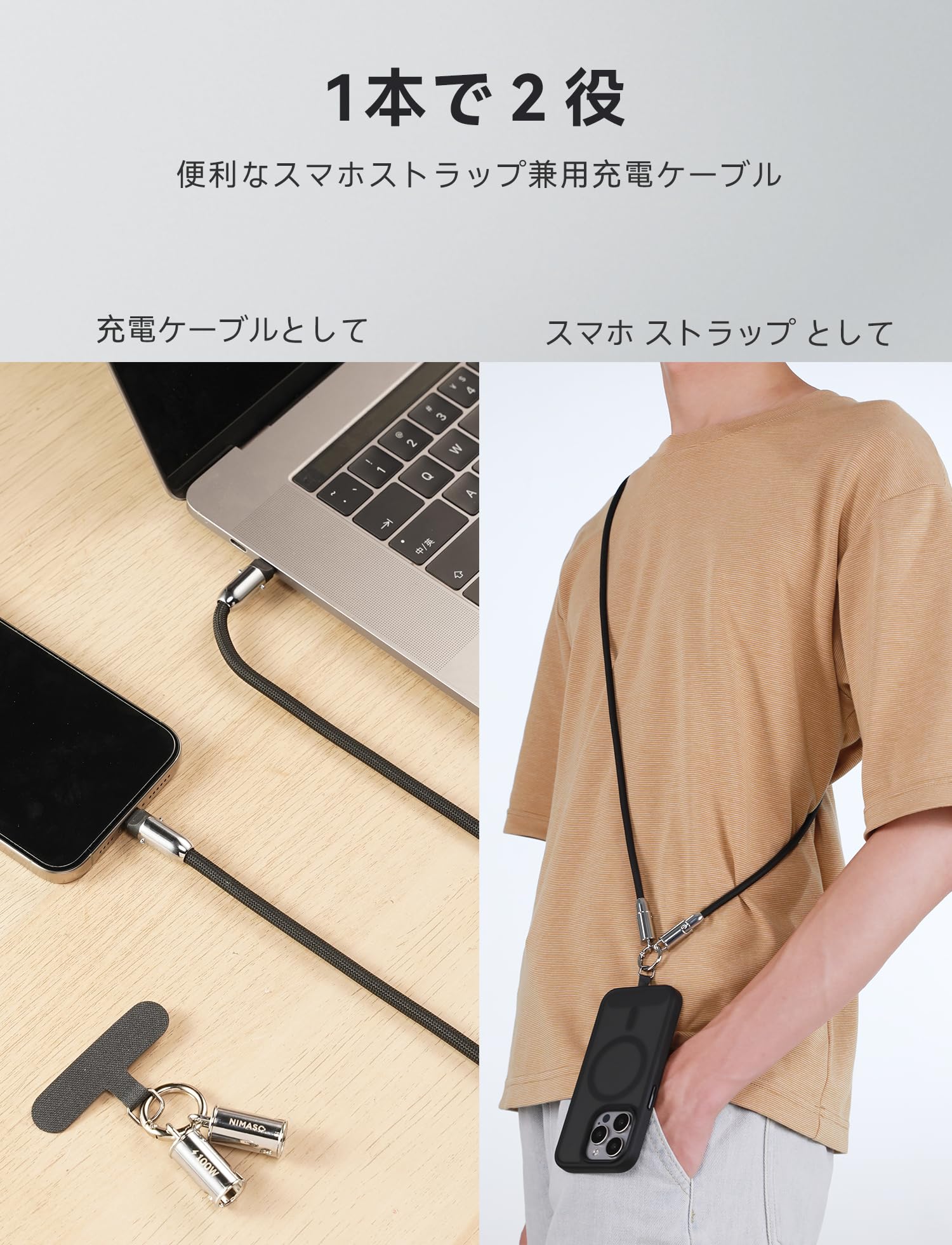 【2-in-1ストラップケーブル】NIMASO USB ケーブルは、充電ケーブルとストラップの2つの便利な機能を兼ね備えた、まさに2-in-1のアクセサリーです。120cmの長さを誇るスマホストラップは、首や肩に掛けて使うことができます。