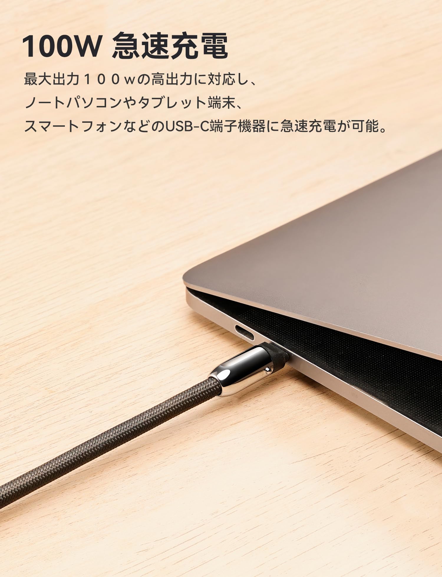 【100Wの超高速充電対応】USB Power Delivery (USB PD) 技術に完全対応しており、最大出力100Wの超高速充電に対応しています。 USB-C to USB-Cの方向充電にも対応しているため、わずか30分でiPhone 15を最大69%まで充電することができます。これは、従来の60Wケーブルよりも58%も高速な充電速度です。▲PD対応の充電器と接続する必要がございます。