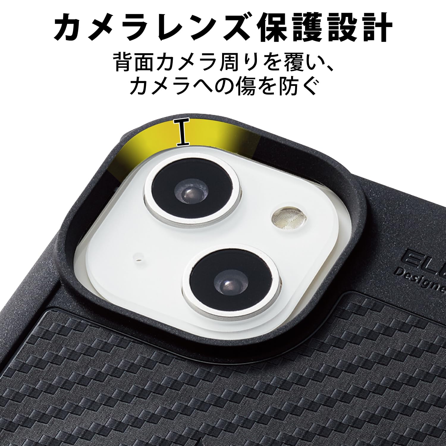 ケース背面から側面にかけてカーボン調のグリップテクスチャーを施すことで、滑りにくくし持ちやすさを向上しています。
