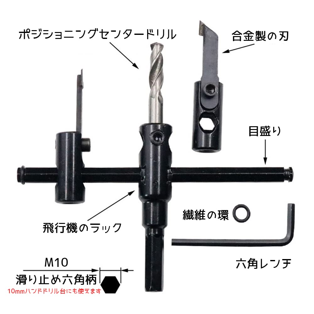 【使用方法】電動ドライバーに取り付けて使用します。目盛りに沿って切断したい円のサイズにカッターを合わせて、 付属の六角レンチでカッターを固定して使用します。センタードリル2種類付きで厚板、薄板どちらでも使用可能です。ご注意:このストアは一括購入をサポートしています。 一括購入については、カスタマーサービスまでにをお問い合わせください。お問い合わせいただければ、満足のいく回答が得られるように返信いたします。