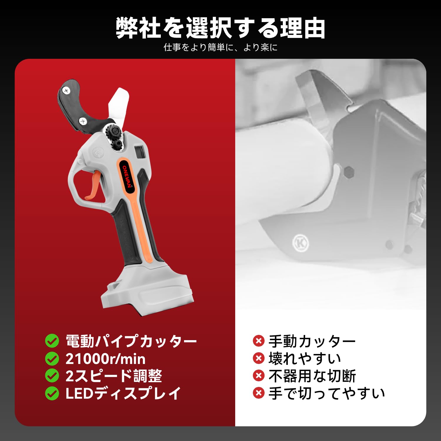 【特価】ONEVAN パイプカッター 電動 塩ビパイプカッター 充電式 エンビパイプカッター コードレス イレクターパイプ 単管パイプカッター マキタのバッテリー互換可能 PVCパイプカッター ブラシレスモーター PPRパイプカッター 切る工具 2段階切断径調節可能 最大切断径35mm LEDディスプレイ付き 軽量 持ち運び便利 バッテリー付き 収納ケース付き | GIGATERA