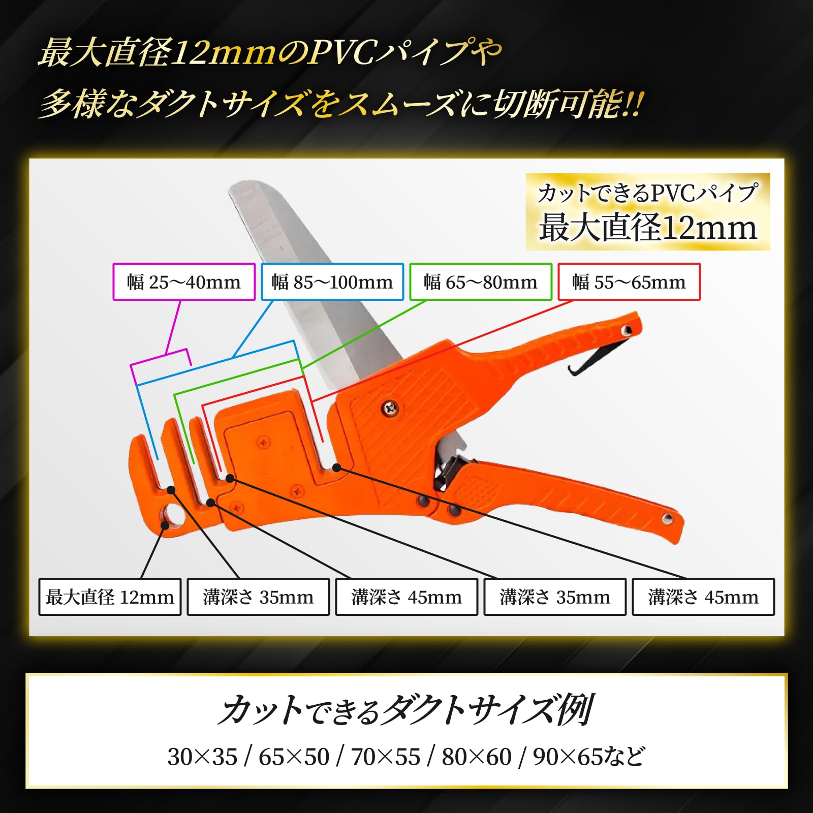 このダクトカッターは、最大直径12mmのPVC(塩ビ)パイプや、さまざまなサイズのダクトをスムーズに切断できます。ツールとしての汎用性があり、幅広い作業に対応します。