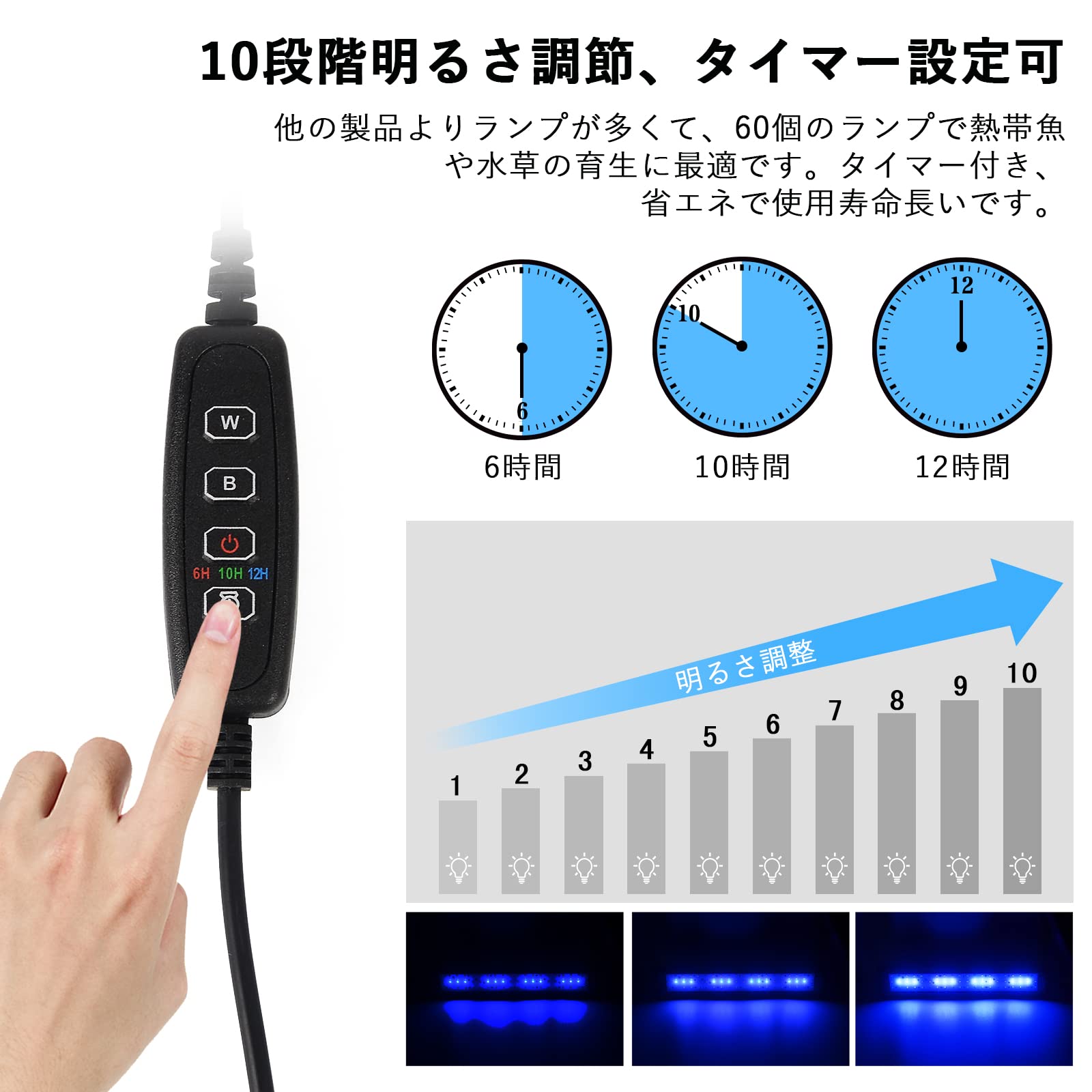 ★11W高輝度LEDライト60個、長寿命★:led水槽ライトが60個高輝度LEDランプを採用し、ただ11wの低電力消費で省エネです。従来の水槽ライトと違い、照射は水槽の奥行き全体まで明るく照らす。LEDの光源の安定性がよく、物の本色が現れ、観賞魚を飼うことあや水草を育成することに最適です。