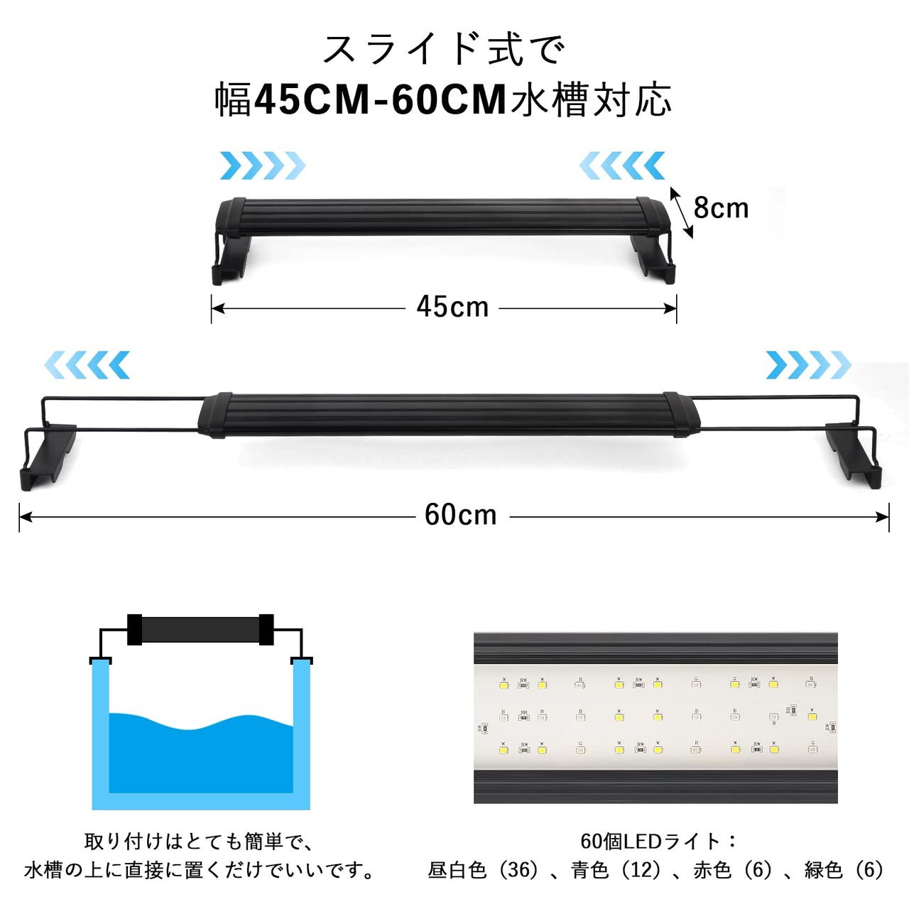 ★幅45-60CM水槽対応、取り付け簡単★:伸縮可能なブラケットが両端に搭載されているため、水槽に合わせてサイズ調節可能、45〜60cmまでの幅広い水槽に対応できます。取り付けは水槽に直接置くだけで簡単です。