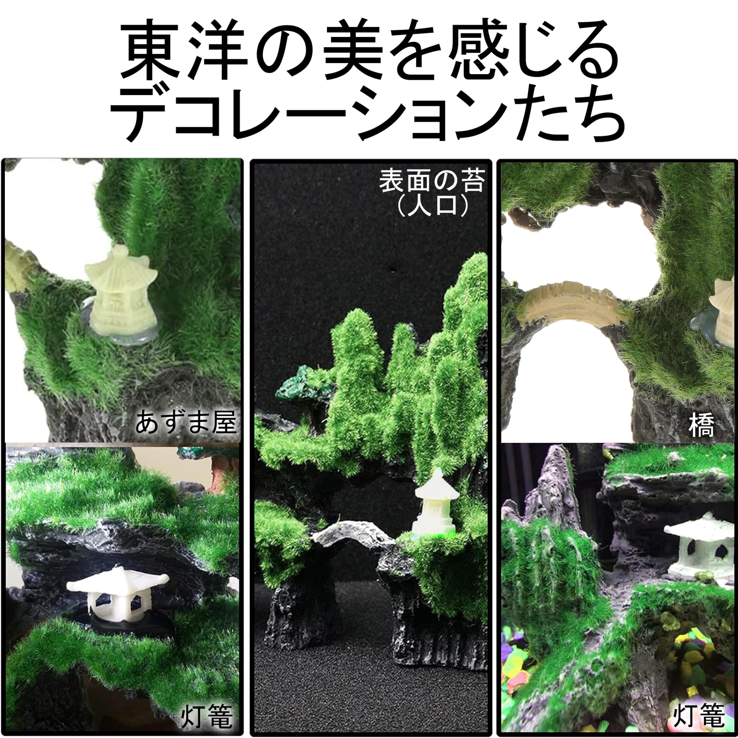 東洋の美を感じさせる壮大な自然の岩山をメインとしたアクアリウムオーナメントです。映える緑が水槽をカラフルに。色とりどりの熱帯魚と相成って癒しの空間へ。