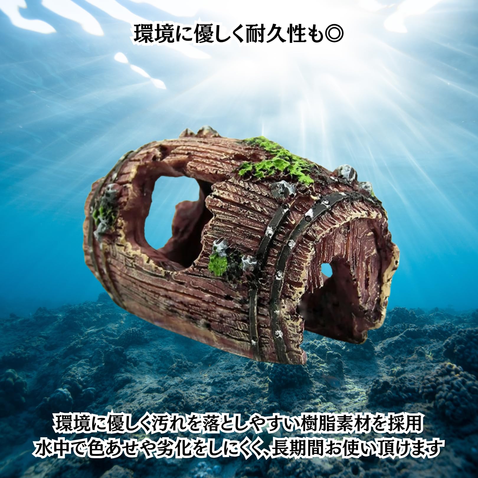 【リアル感漂うおしゃれなオーナメント】海底に沈む朽ちた酒樽をモチーフにした、アンティーク調のアクアリウムオーナメントです。独自の塗装技術により、本物のようなリアルな質感と色合いを再現しております。おしゃれで味のある、素敵な水槽レイアウトの演出に最適です。