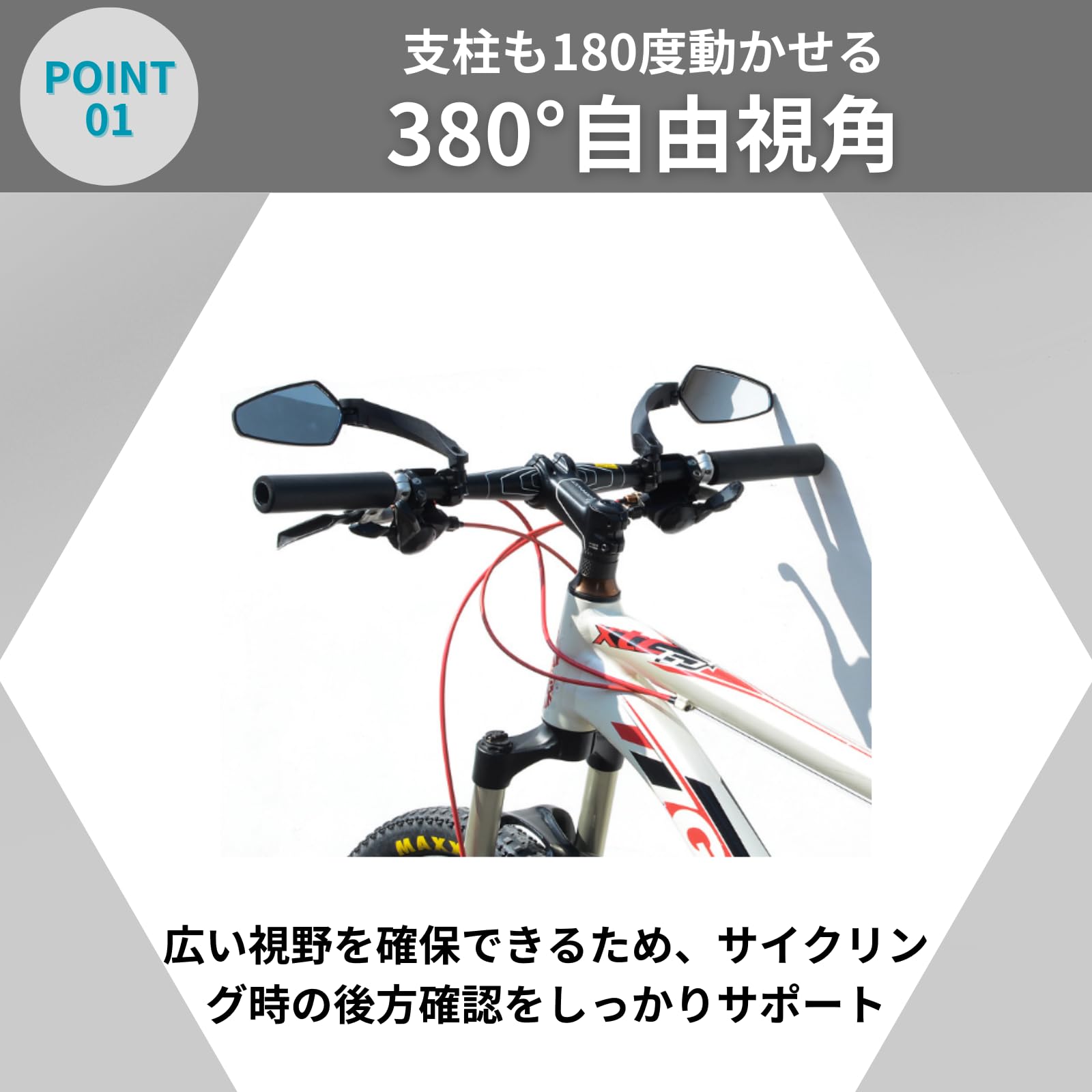【380°自由視角】バックミラーを装着しない場合、サイクリング中に後方を確認しようとすると、バランスを崩して転倒し、事故につながる可能性があります。この自転車ミラーは、丸型・菱形を問わず360度回転でき、支柱も180度動かせます。広い視野を確保できるため、サイクリング時の後方確認をしっかりサポートします。