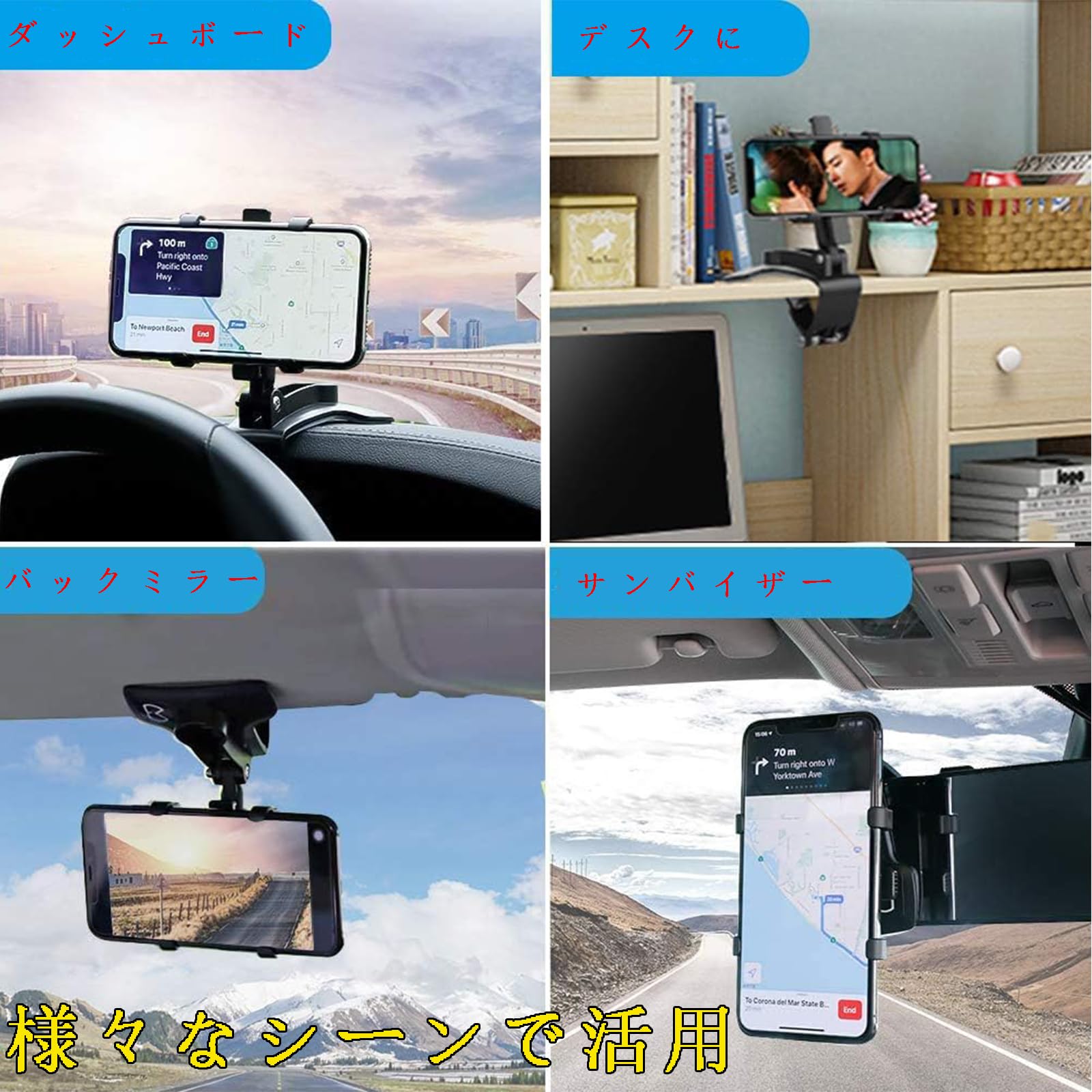 【幅広い互換性】車載ホルダーとして車内のダッシュボード、サンバイザー、バックミラ?はもちろん、 普通のスマホホルダーとしても寝室、オフィスなど多場所に取り付けることができます。iPhone/Huawei/Samsung/Sony/LGなど4-6.5インチ全機種対応.GPSナビゲーション、天気予報、音楽、交通情報など、スマホの便利な機能をすべて利用でき。 【高品質な素材&耐久性】ABS樹脂素材を使用し、耐熱性、安全性、耐久性、お手入れが簡単、-40?100℃の温度に耐え、高温暴露による変形がありません。夏でも冬でも便利に使えます。製品に問題が発生した場合は、運送途中での箱潰れ、付属品不足、商品破損、初期不良が発生した場合、全額または無料で商品交換を対応し、お客様のニーズに合わせ、24時間以内に返事致します。