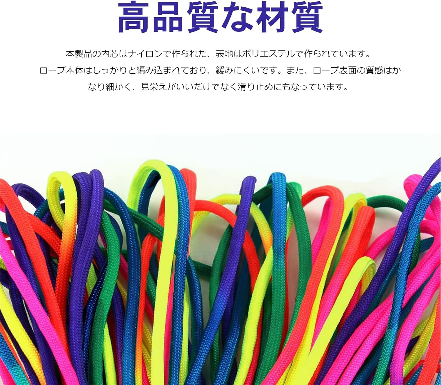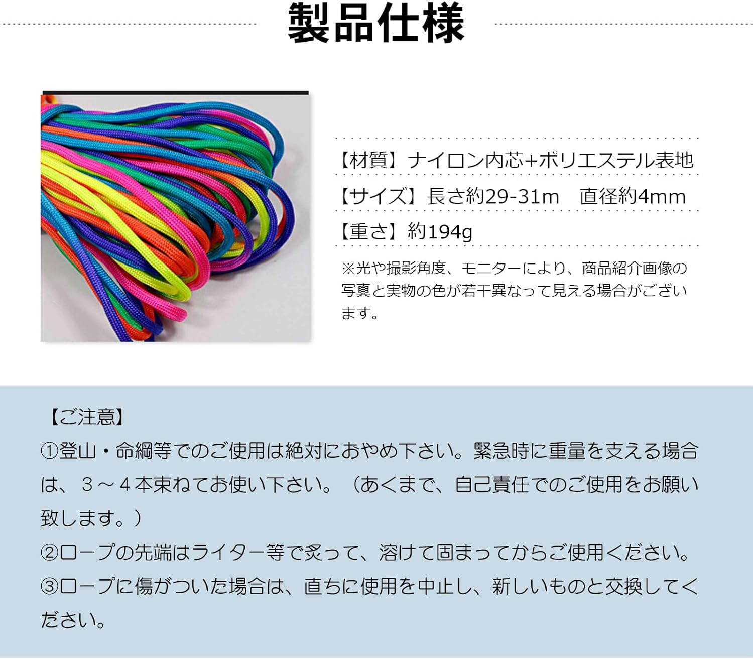 【ご注意】 ①登山・命綱等でのご使用は絶対におやめ下さい。緊急時に重量を支える場合は、3〜4本束ねてお使い下さい。(あくまで、自己責任でのご使用をお願い致します。)②ロープの先端はライター等で炙って、溶けて固まってからご使用ください。③ロープに傷がついた場合は、直ちに使用を中止し、新しいものと交換してください。