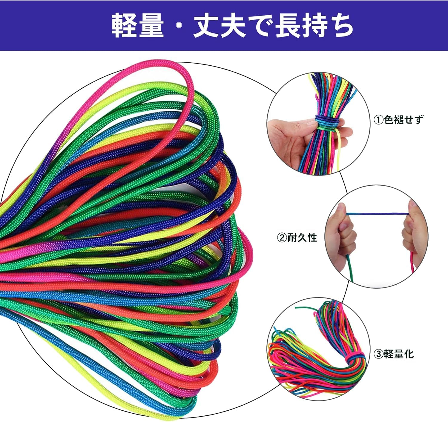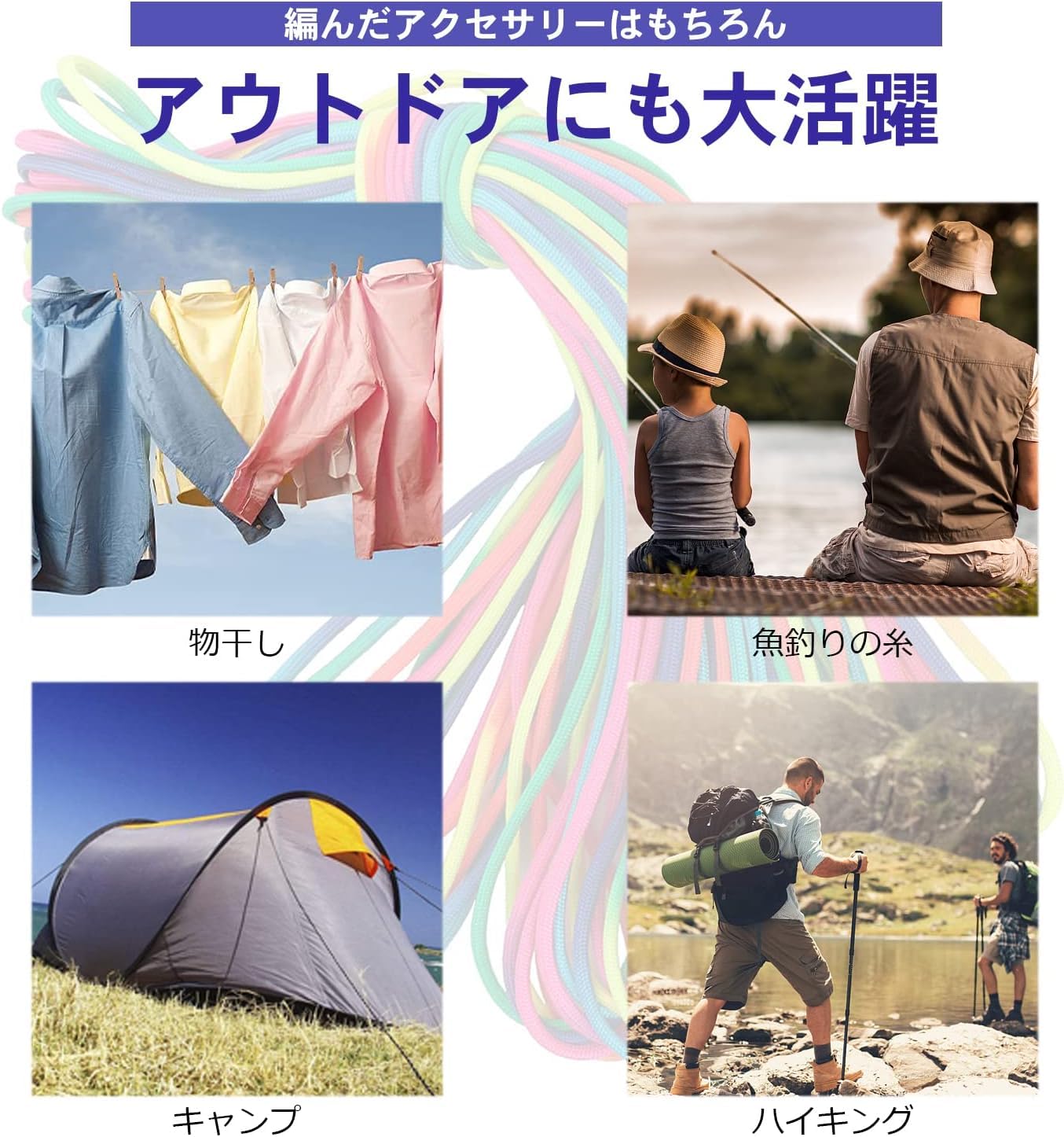 【用途幅広い】 物干し、テント用、巻線ハンドルなどにはもちろん、子供のアクセサリーやブレスレット、手作りなどに使用する人が増えています。特にパラコードで編んだアクセサリーが人気です。例えば、ブレスレット、腕時計のストラップ、カメラのストラップ、携帯電話のストラップ、犬の首輪やリード、ハンドバッグ、キーホルダーなどを編んだものがあります。