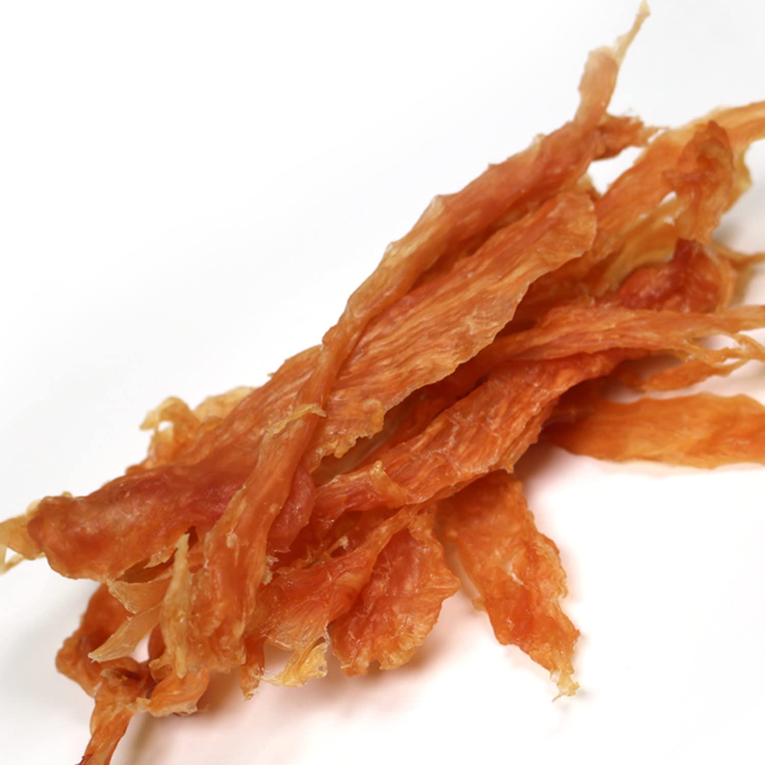 ●鶏ささみと鶏スジ肉だけ使用し、しっとりジューシーに調味加工したしっかり噛めるおやつ。