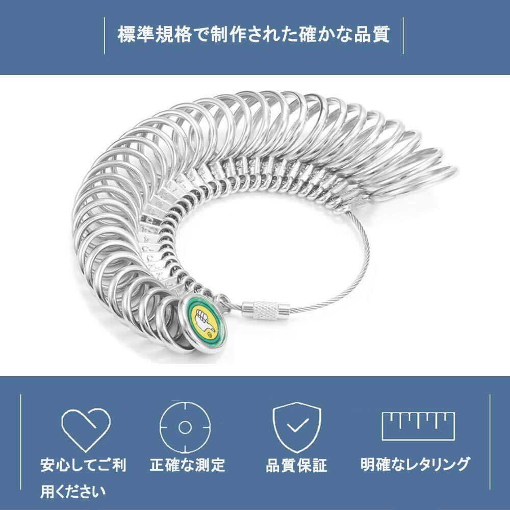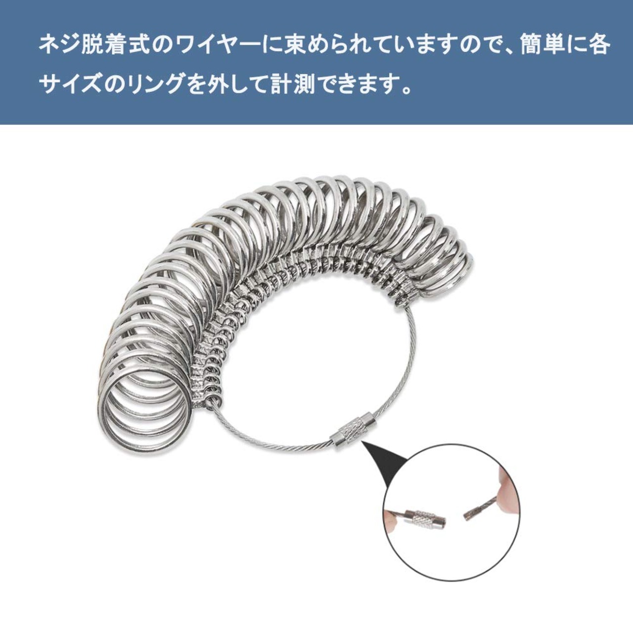 【測定時のご注意】リングゲージ 自体の重さで指とゲージの間に隙間ができ、実際の サイズ より緩くなる場合があります。測定時には、ワイヤーから外すか手のひらに接地させてお測り下さい。指輪を着ける指の腹より第二関節が太い方は、関節が無理なく通るサイズが適正なサイズとなります。体調などで指のサイズが変化することがございますので、朝夕それぞれ1回ずつ測定してください。