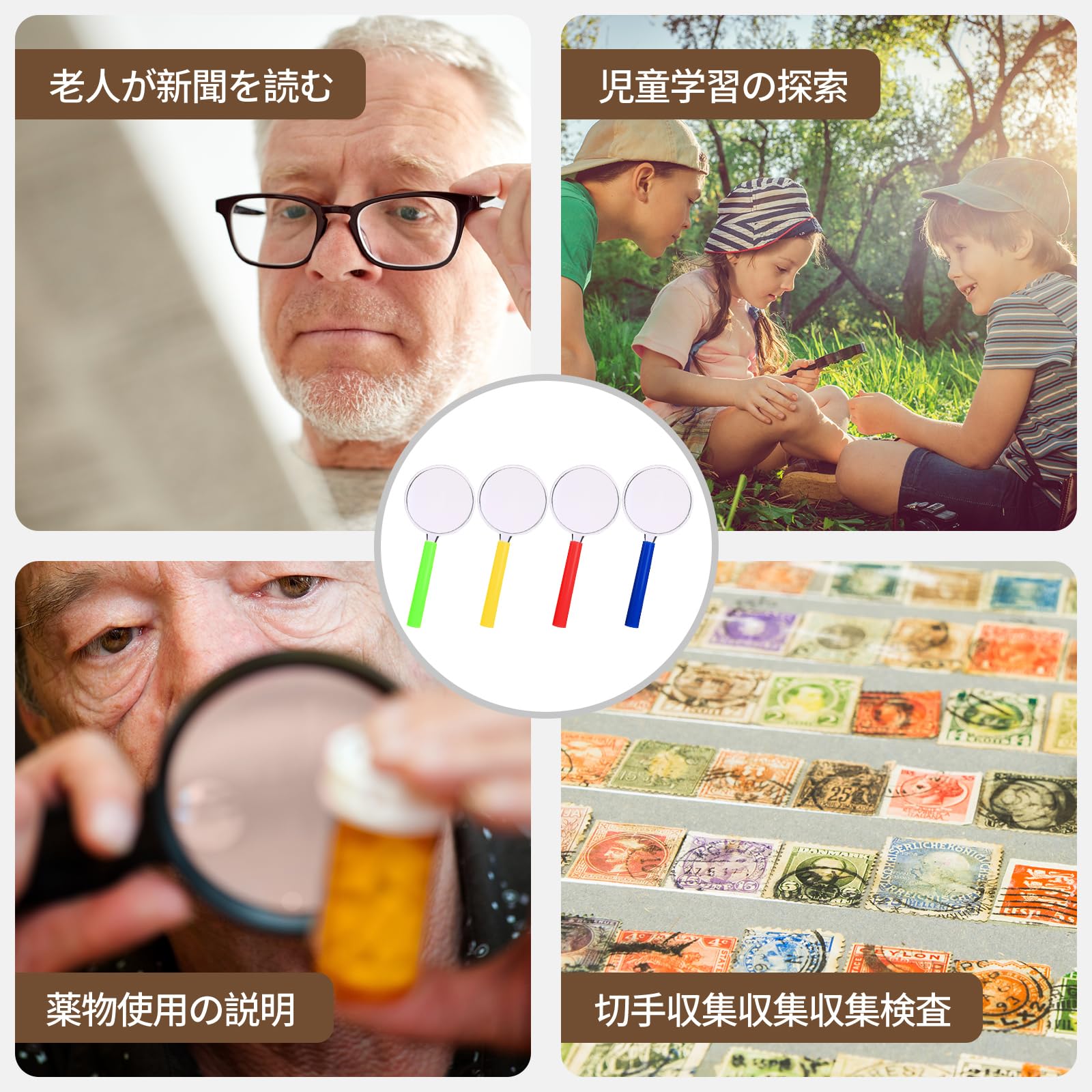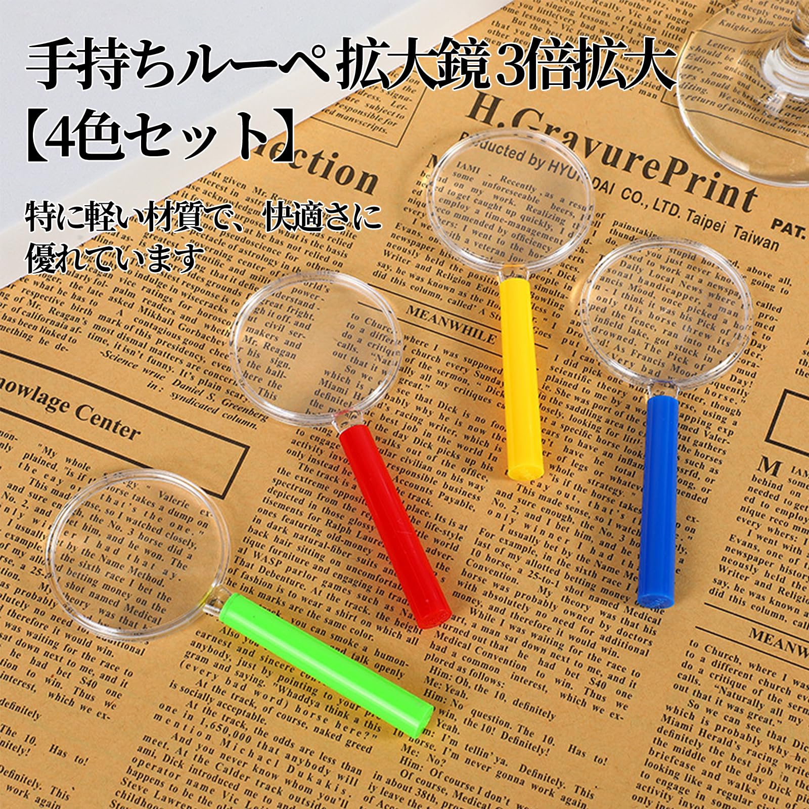 Doyime 手持ちルーペ 拡大鏡 3倍拡大 【4色セット】 虫眼鏡 ルーペ 読書ルーペ 拡大レンズ 携帯用拡大鏡ル 携帯便利 読書 地図 雑誌 新聞 読書用 子ども 高齢者及び専門家使用可能 直径45mm 青 黄 赤 緑