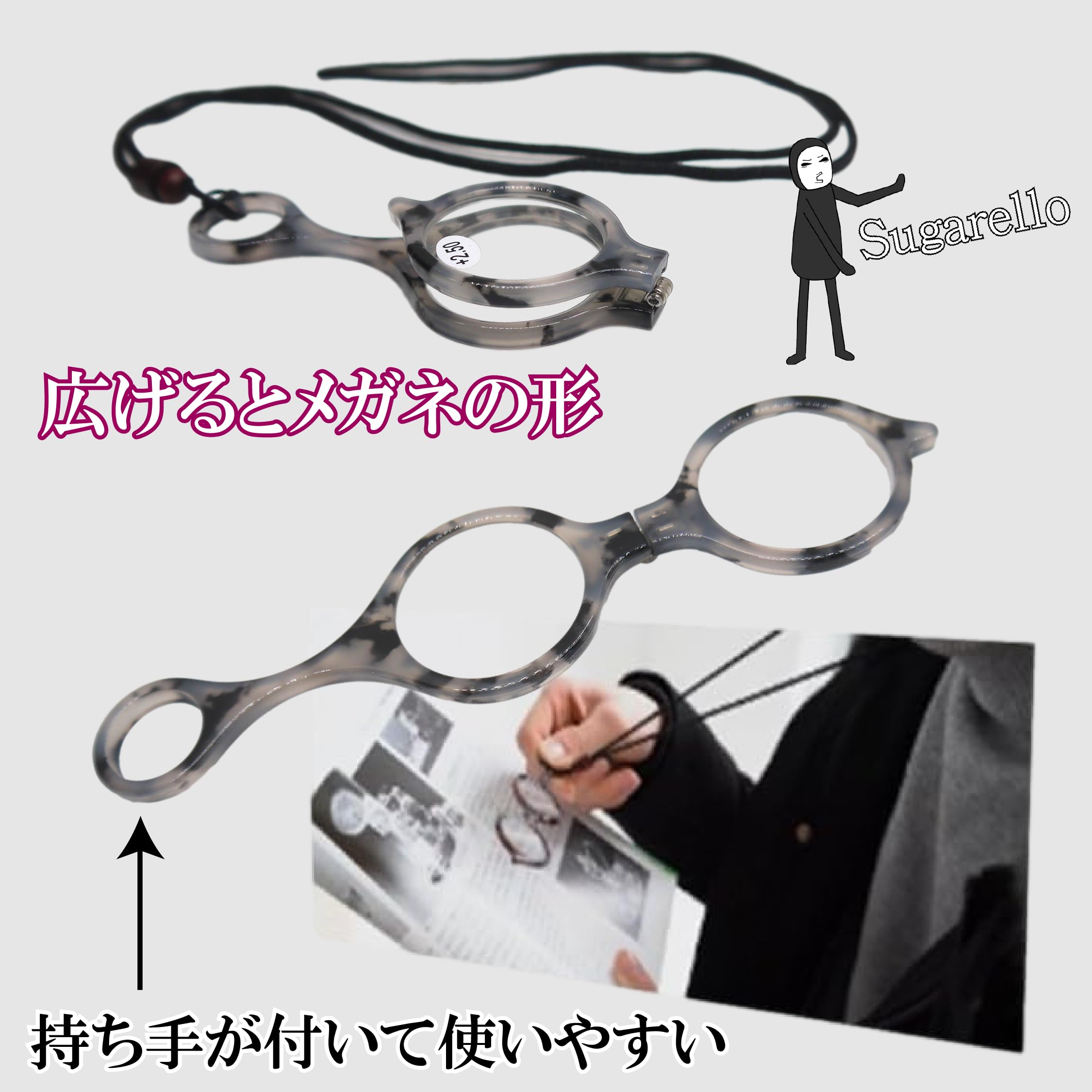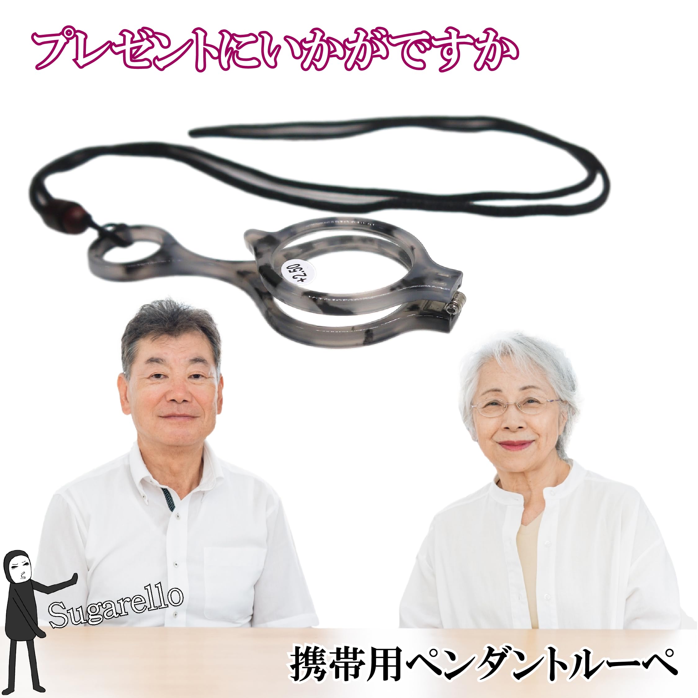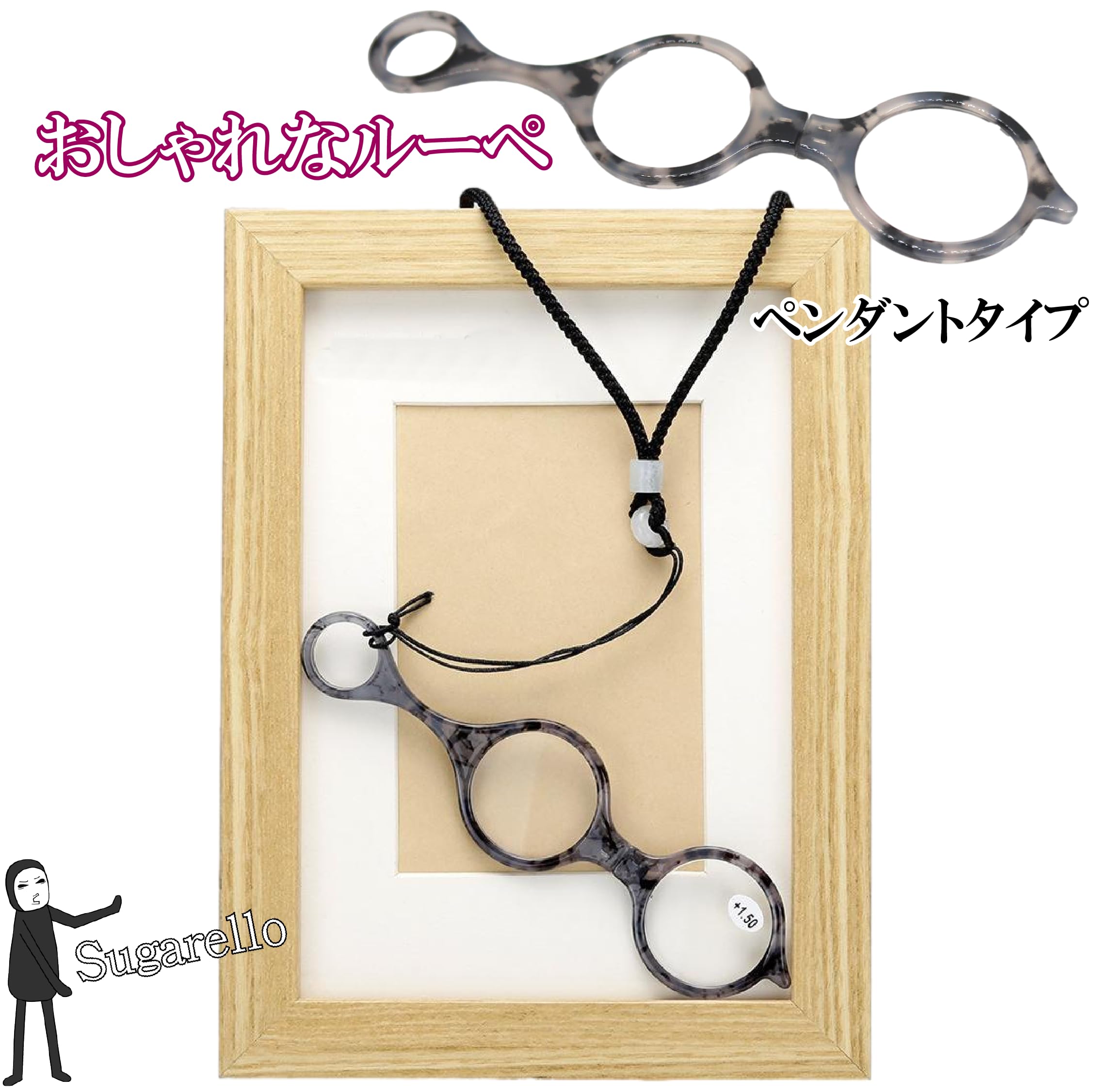 Sugarello ペンダントルーペ 首掛け 携帯用 ネックレス 拡大鏡 ルーペ眼鏡 ペンダント ルーペメガネ ルーペネックレス おしゃれ 折り畳み レディース プレゼント (+1.5 50代)