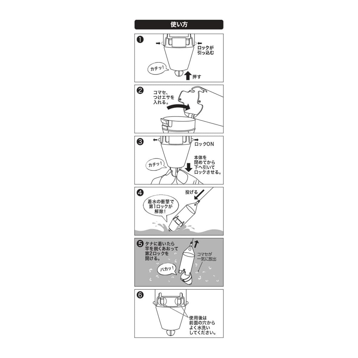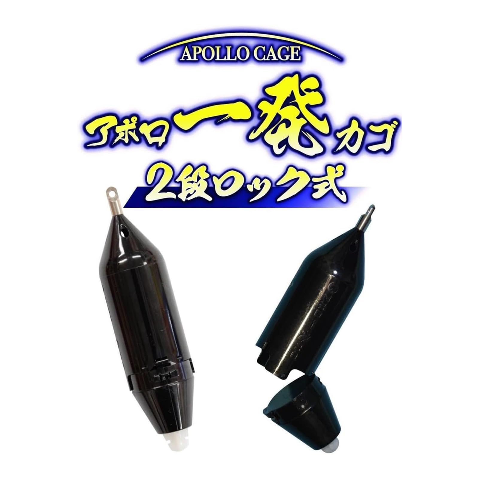 新製品「アポロ一発カゴ」は、2段ロック式で、ロック機構をコマセカゴにすべて内蔵させました。外周にロック機構を出さないことにより、糸がらみ、衝突による変形を防ぐ、遠投性に優れた形状を形成できる、画期的な一発カゴです。カゴの大きさは、“アポロカゴと同程度寸法です。海面に当たると作動する第1ロック機構! シャクると開く第2ロック機構!