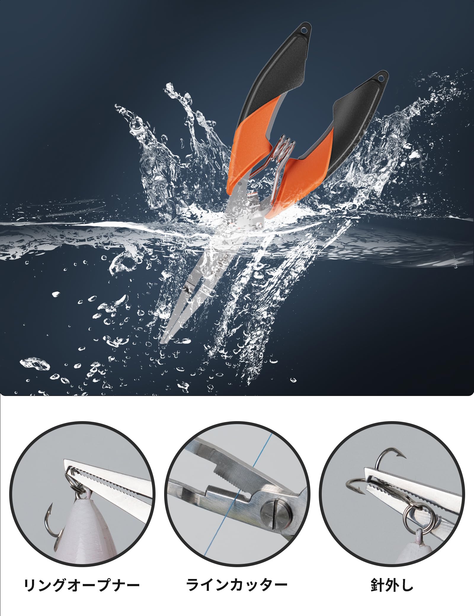 フィッシングプライヤーは高強度ステンレスを使用しており、軽くて、防水で錆びにくいです。使用後、清水で洗って、ドライ環境に置けば、長持ちできます