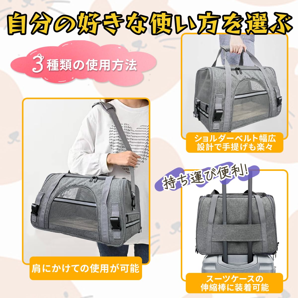 【便利なデザイン】猫用キャリーバッグは長さ調節可能なショルダーベルト付きで、肩掛け・手提げの2WAY使用が可能。背面にはスーツケースの伸縮ポールに固定できるストラップも装備しています。