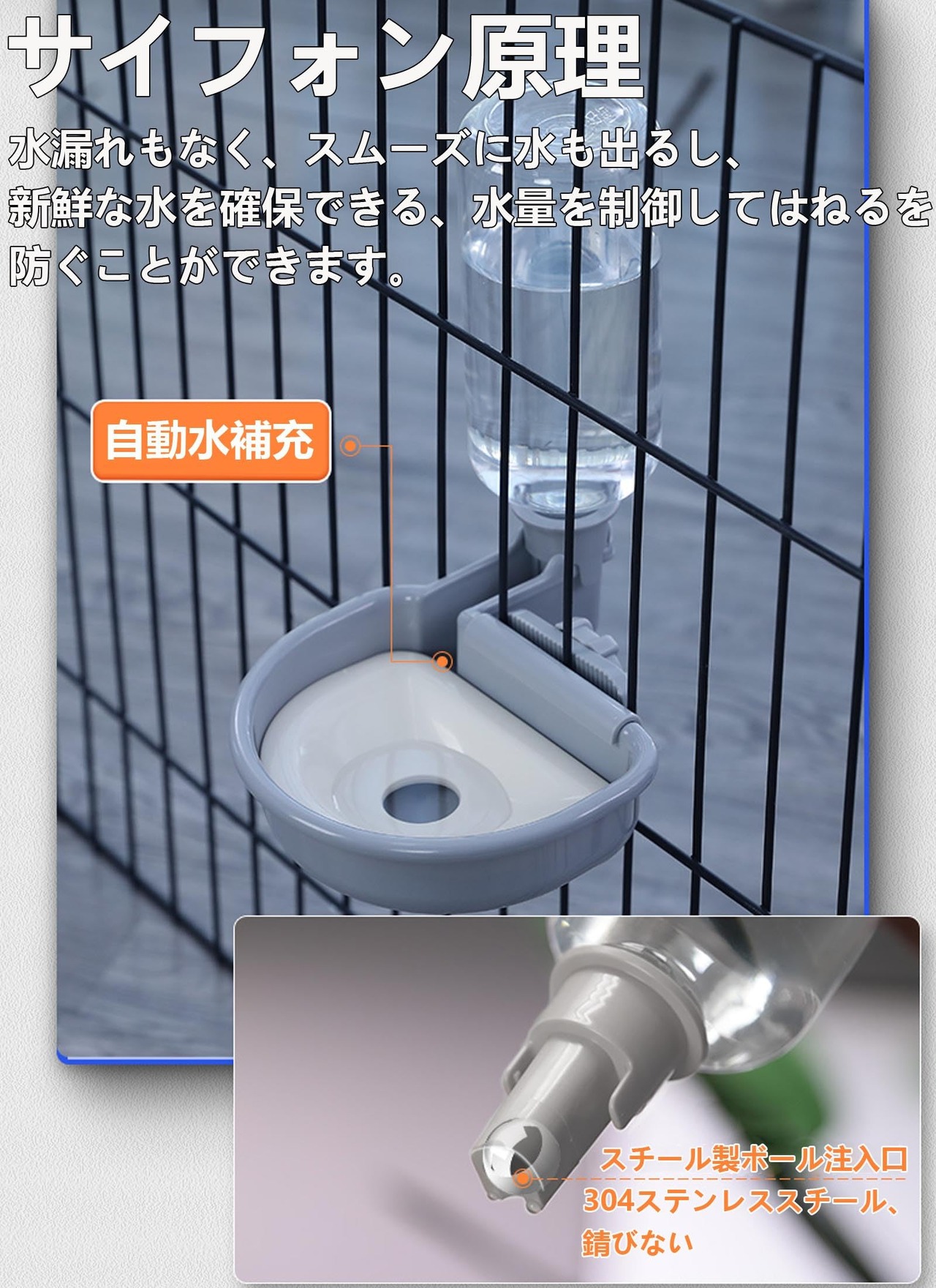 【自動給水器】給水ボトルもしっかりしていて、ある一定の量のお水が入るとちゃんと止まるので漏れたりしていません。ボール弁が付いで水漏れを防止できる。ケージに取り付けられペットの水分補給を簡単に行うことができる給水器。自動給水器は水を大量に飲むであろう、夏用に熱中症対策。毎日使っています。