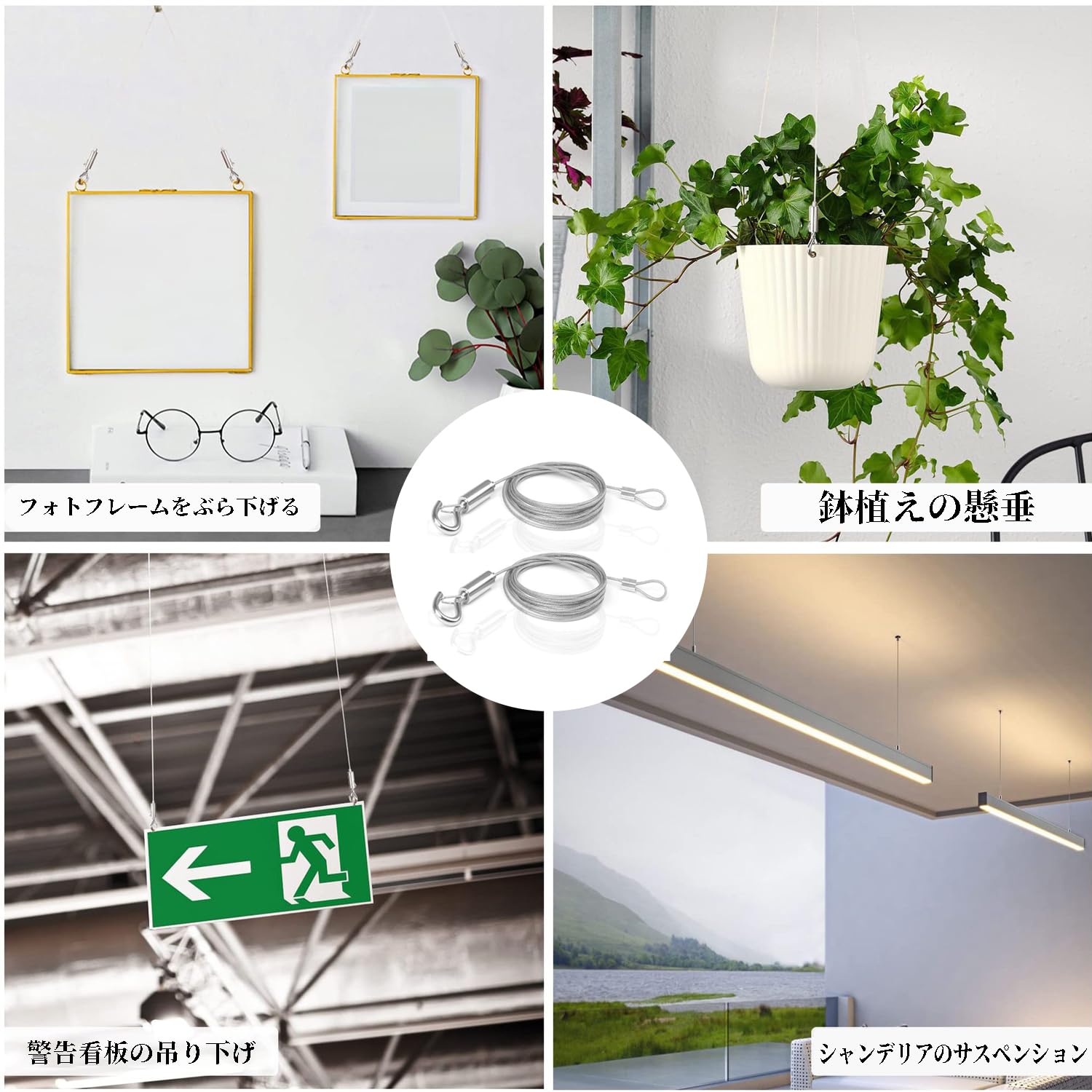 [取り付けが簡単] 1本の安全ワイヤーの耐荷重は20kgです。フックとワイヤークランプが付いているので取り付けが簡単です。取り付け後は軽く引っ張って安全を確認してください。吊り下げたい対象物をフックに掛け、対象物を上に上げるときは下に出てるワイヤーを持ち、そのままフックを上げます。