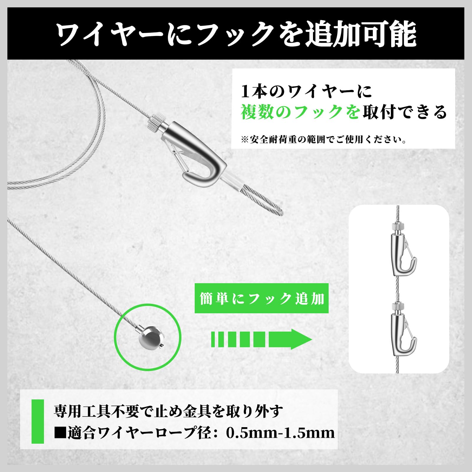 ??【末端溶断留め・フック追加可能】 ワイヤーにはバリ等は一切ありません。フックの作動も滑らかで、物をぶら下げる際にワイヤーの端が指に刺さらないよう、ワイヤーのカシメと端末処理もされています。【改良版・フック追加】止め金具が付いているため、荷重内であれば1本のワイヤーに複数のフックを付けることもできます。?? 例えば、1本のワイヤーに掲示物などを2つ飾りたい場合は、ワイヤーの端に付いた止め金具を取り外して(工具不要、力もいらず女性や子供でも5秒で取り出せます)、垂らしたワイヤーの下部から複数のフックを挿入するだけです。ワイヤーを別途購入する必要もありません。??収納やインテリアに取り入れ、スッキリとした空間を演出しましょう。注意: 耐荷重内でご使用ください。