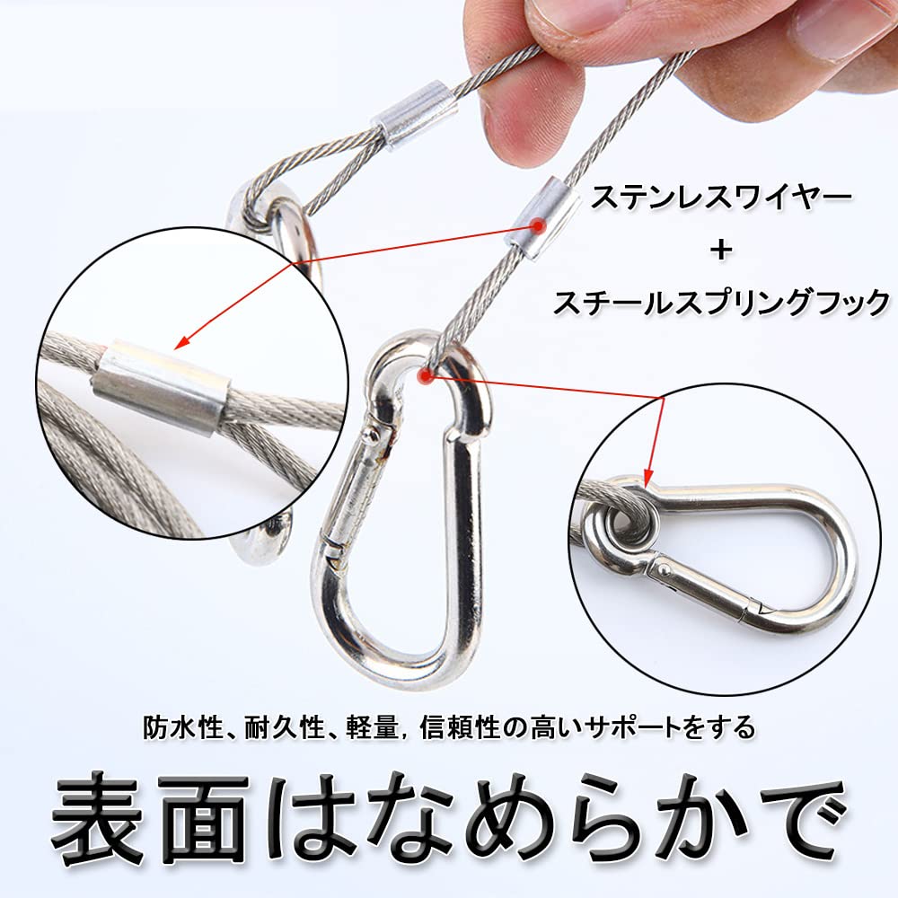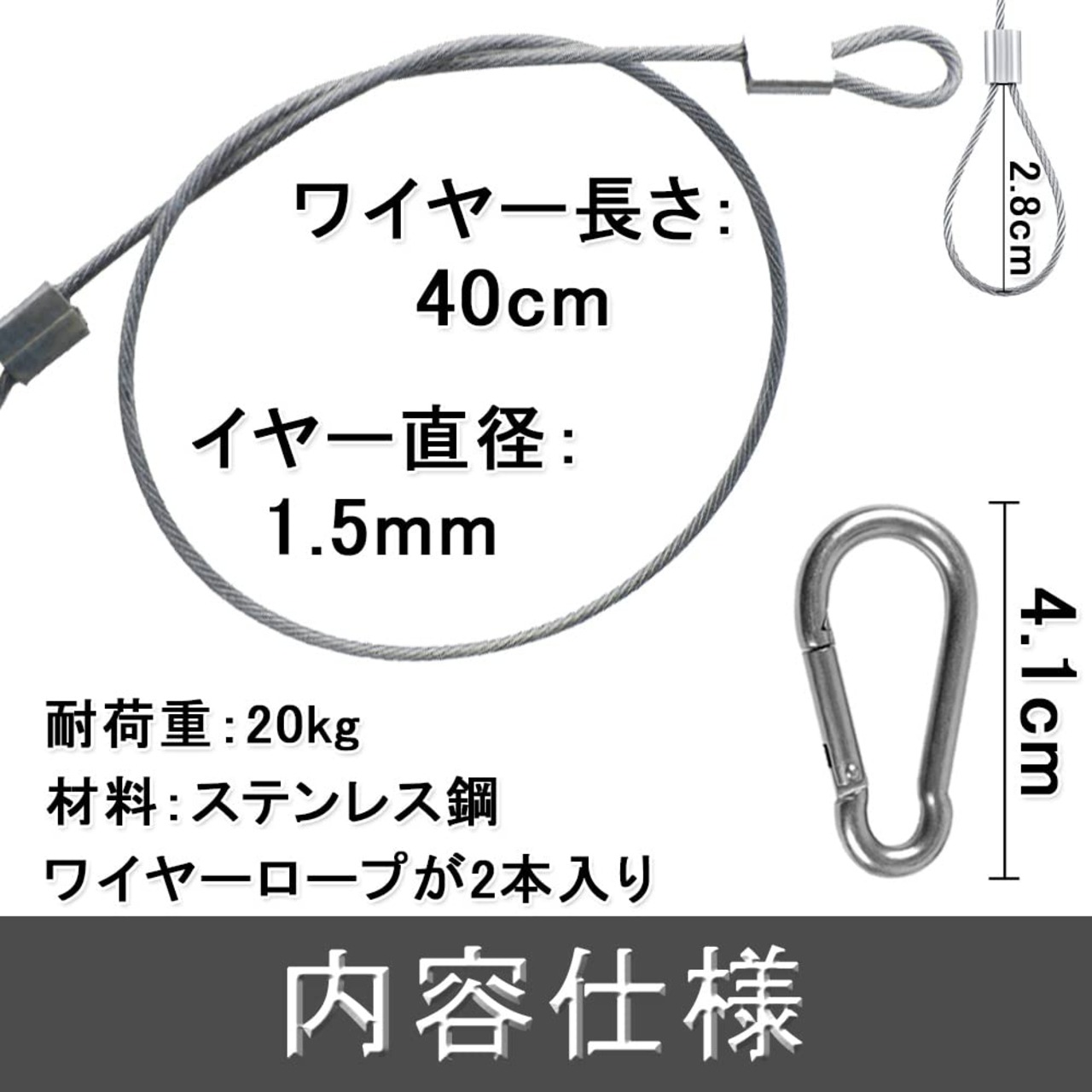 【内容仕様】ワイヤーロープが2本入り;材料:ステンレス鋼;ワイヤー直径:1.5mm;ワイヤー長さ:40cm;カラビナ部分:5cm;耐荷重:20kg
