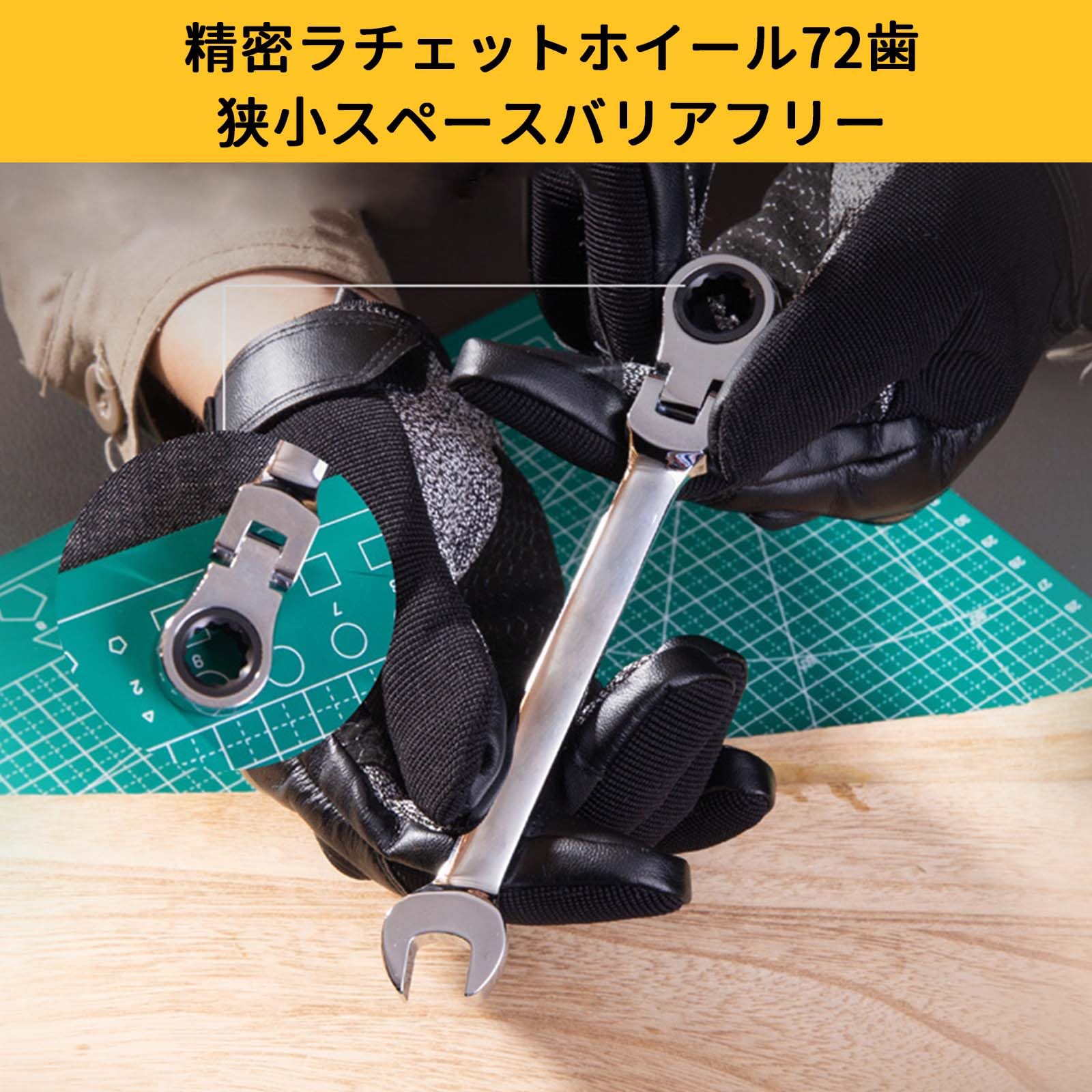 【特徴】 通常のレンチは平面上で使用する場合、レンチの下に指が届きませんが、可動ヘッドラチェットレンチは平面上で掴むことができるため、力を加える際に便利です。