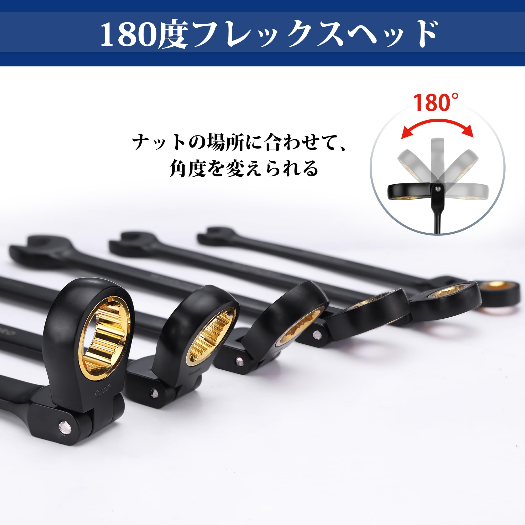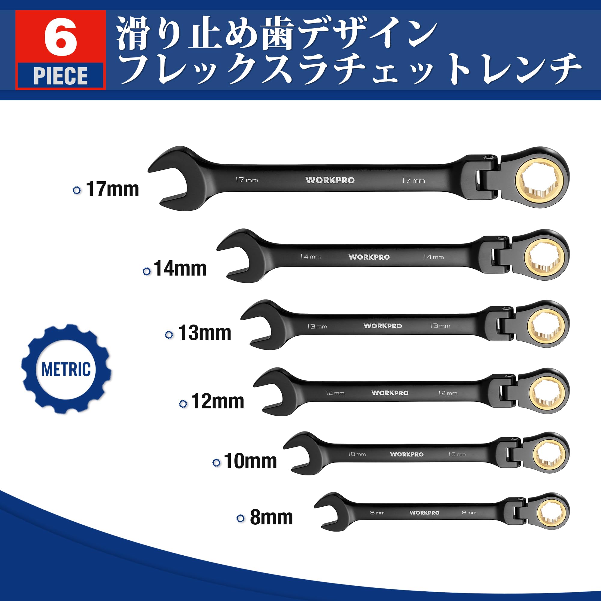 WORKPRO コンビネーションレンチ フレックスラチェットレンチ 6本組(8、10、12、13、14、17mm) 首振りラチェット スパナ なめたボルト・ナット対応可能 72ギア 両用ヘッド CR-V製 組み立て 自動車修理 メンテナンス用 収納袋付き