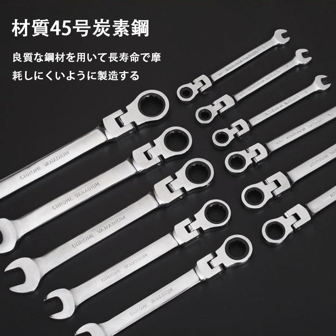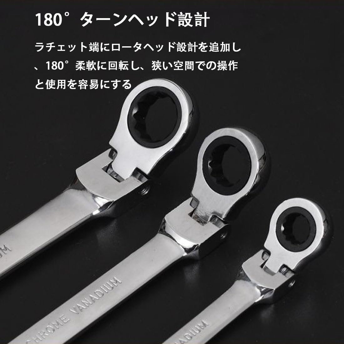 【180度フレキシブルヘッド】ラチェットレンチは180°多角度フレキシブル調整を支持し、ボルトとナットの輪郭に正確にフィットでき、力を加えた時に角に損傷を与えることを効果的に回避できる。柔軟なヘッドを使うことで、狭いスペースでの操作に便利です。