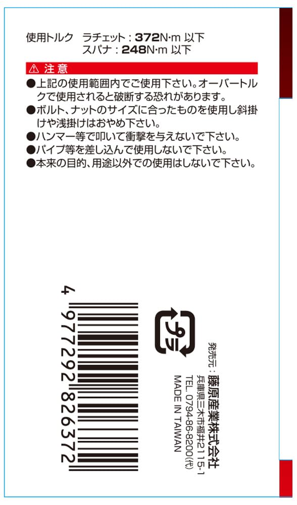 使用トルク(ラチェット):372N・m以下