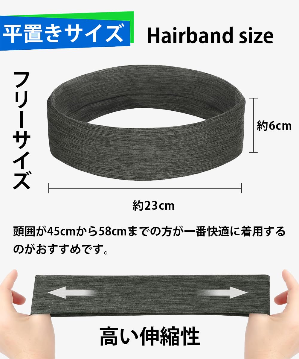 【3枚セットでお得】サイズ:約23cm×6cm(フリーサイズ)、頭囲54~58cm対応。1セット3枚入りで洗い替えに便利。オールシーズン使用可能なため、一年中活躍します。薄手で超軽量なため、折りたたんでポケットに入れても邪魔になりません。