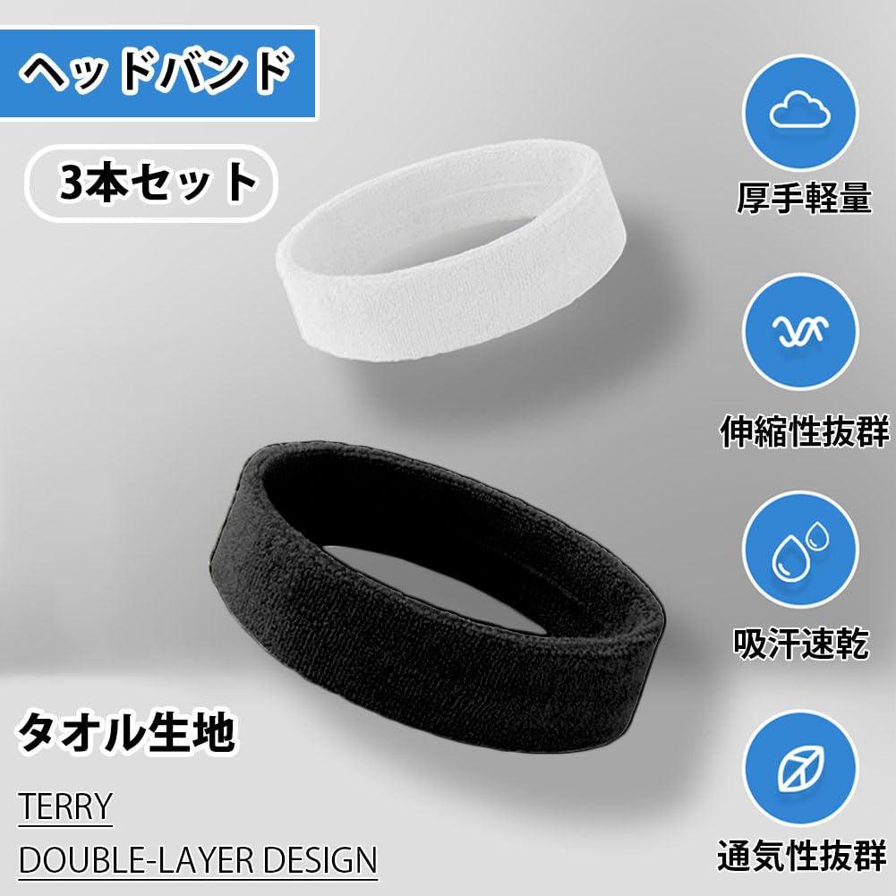ヘッドバンド メンズ ヘアバンド レディース スポーツ 吸汗通気 伸縮性あり 肌触り柔らかい 抗菌防臭 軽量 厚手【スポーツ用・洗顔用】ランニング ダンス ヨガ テニス 野球 自転車 男女兼用 オールシーズン【3本セット】 (ブラック+ブラック+ブラック)