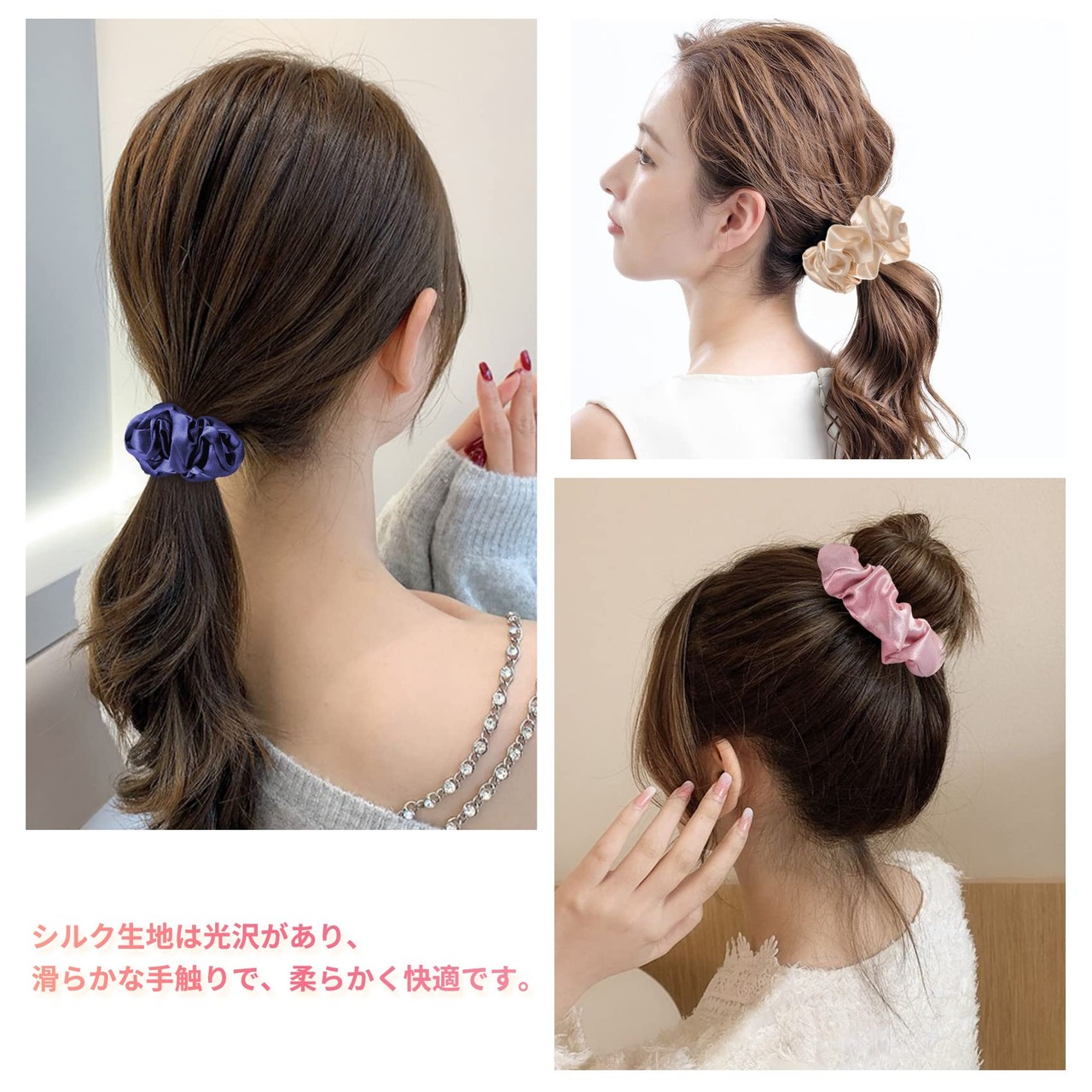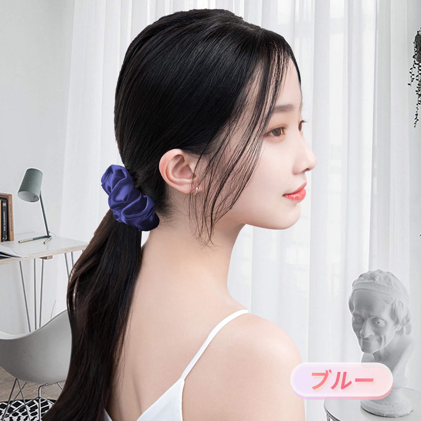 シルクゴム:シルクを使用したヘアゴムは、光沢があり滑らかな手触り。柔らかく伸縮性に優れており、髪に優しくしっかりフィットします。髪を結んでも跡が付きにくく、髪への負担をやさしく軽減します。カラー:ブラック・ピンク・ブルー