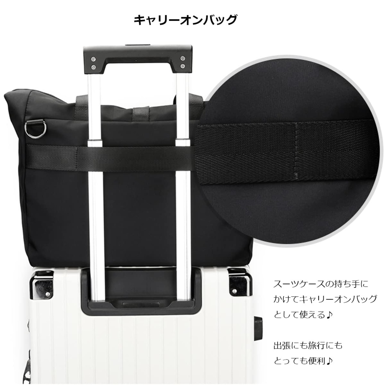【便利性】メイン収納部に大きく開き、物の出し入れがしやすいです。天面にジッパーがあるし、さらにフックも付いているので、書類やパソコンなどを汚れから守り、防犯面やプライバシー面でも安心です。また背面部分にはスーツケースに固定できる構造で、キャリーオンバッグとしても活躍できるので、旅行や出張時とっても便利です!
