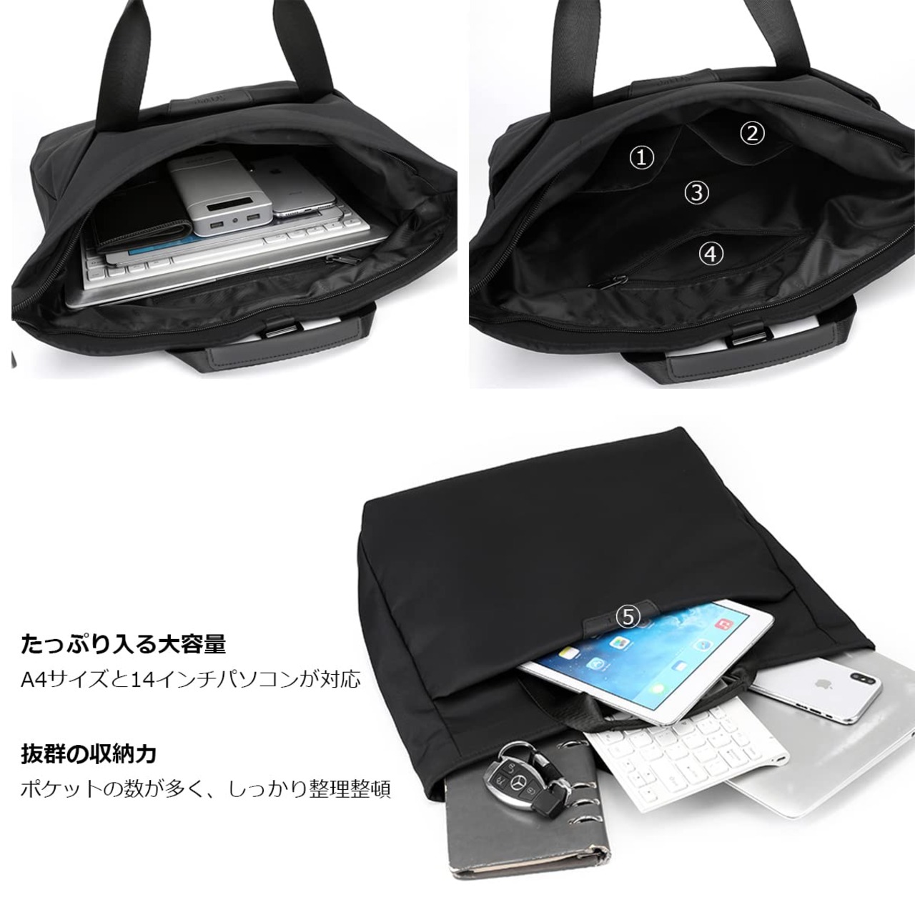 【大容量】A4サイズの書類は勿論、ビジネスには必要の14型ノートPCも楽々入る大容量です。ポケットも多く、整理しやすくて、手帳、スマートフォン、折り畳み傘、財布など必要な物が十分入るからこれ一つでお出かけ可能です。