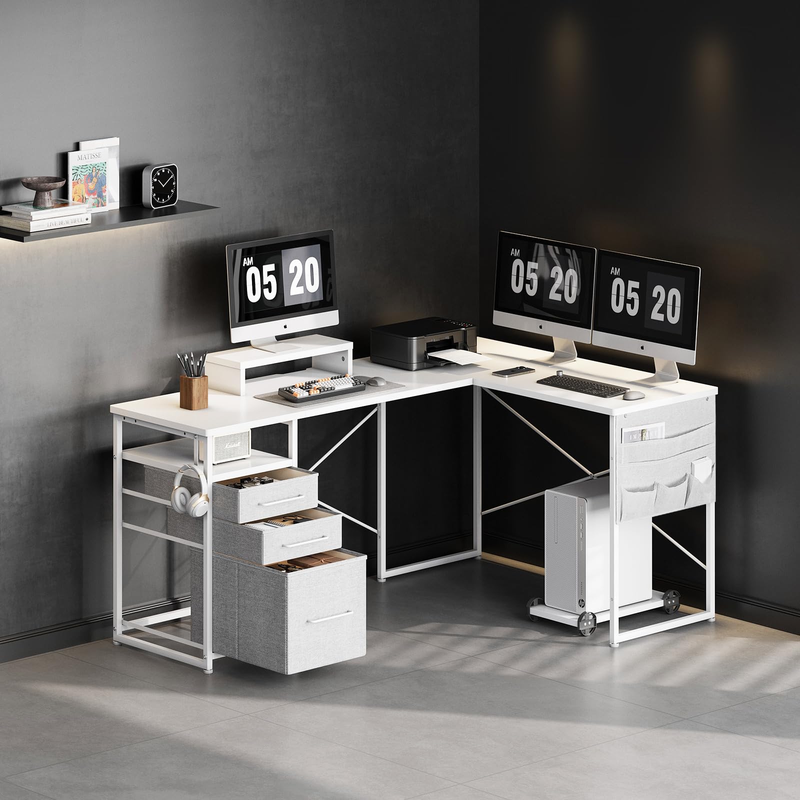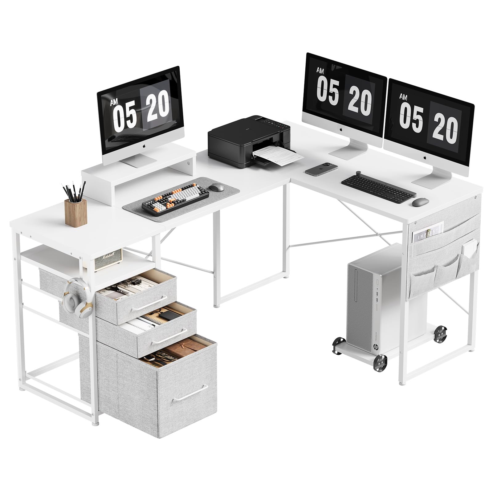 Maihail l字デスク 机 pcデスク ワークデスク コーナーデスク 勉強机 デスク 引き出し付き コーナーデスク 幅160cm×奥行112cm 左右入替可 白い