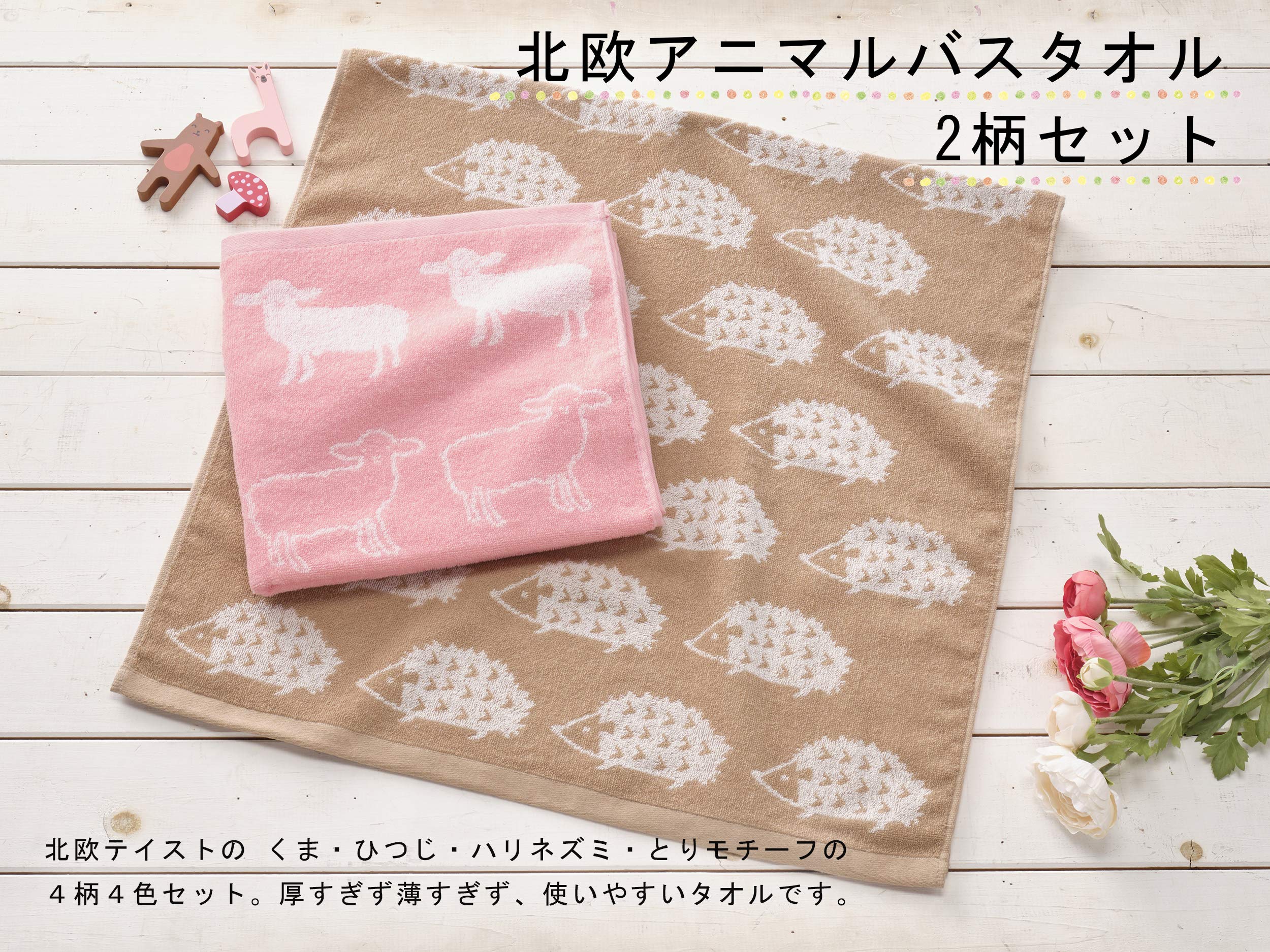 Kosugizen バスタオル 北欧アニマル 2色(2柄)各1枚入 60×120㎝ 北欧風モチーフ ほどよいボリューム感 2枚セット SV-693-2