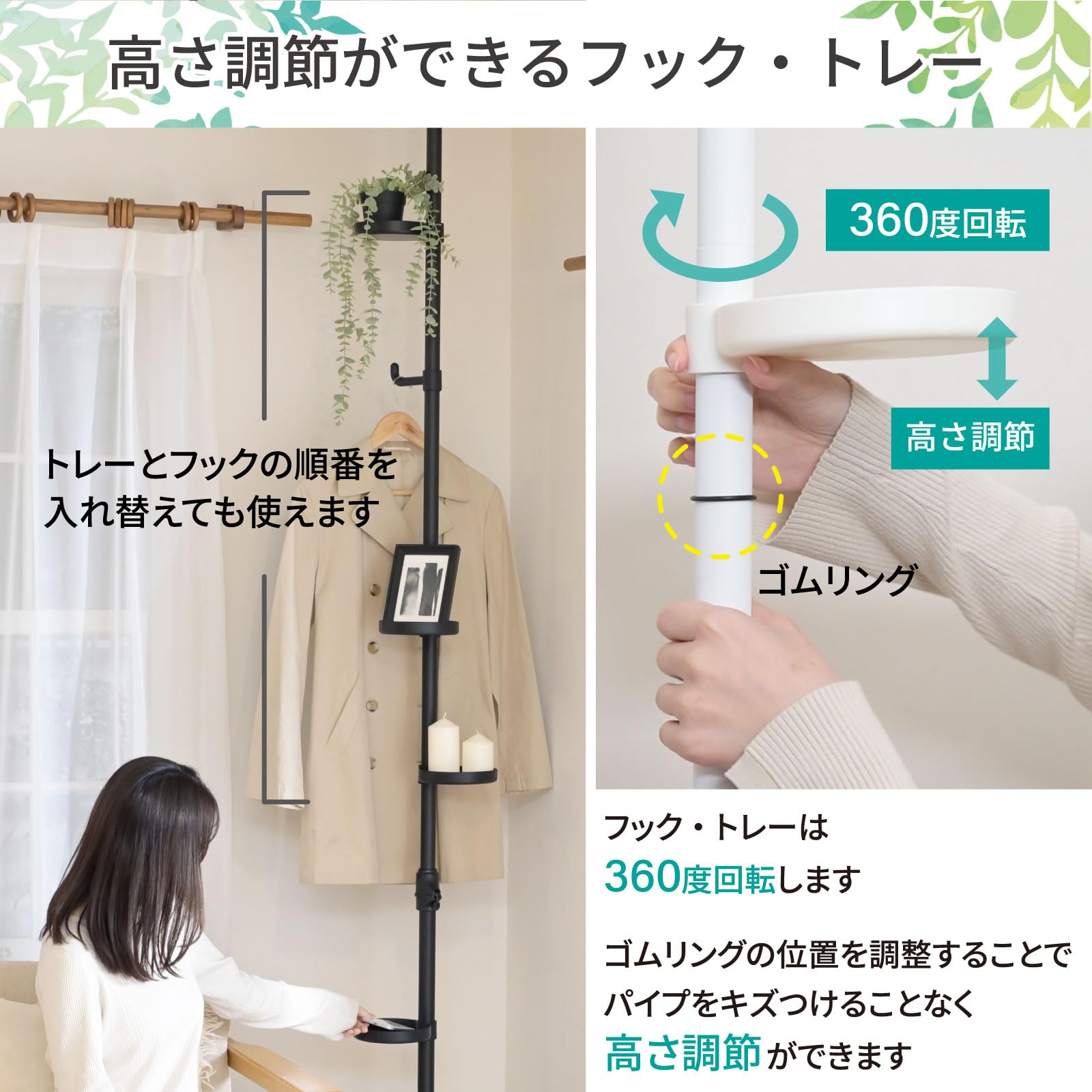 山善(YAMAZEN) 突っ張り ラック ポールハンガー プランタースタンド 設置簡単 (トレー4個・フック1個付き) ワンタッチ突っ張り (実用新案取得済) 幅30×奥行30×高さ190-260cm フラワースタンド ボタニカル 室内 組立品 マットブラック WJE-12RM(MBK)