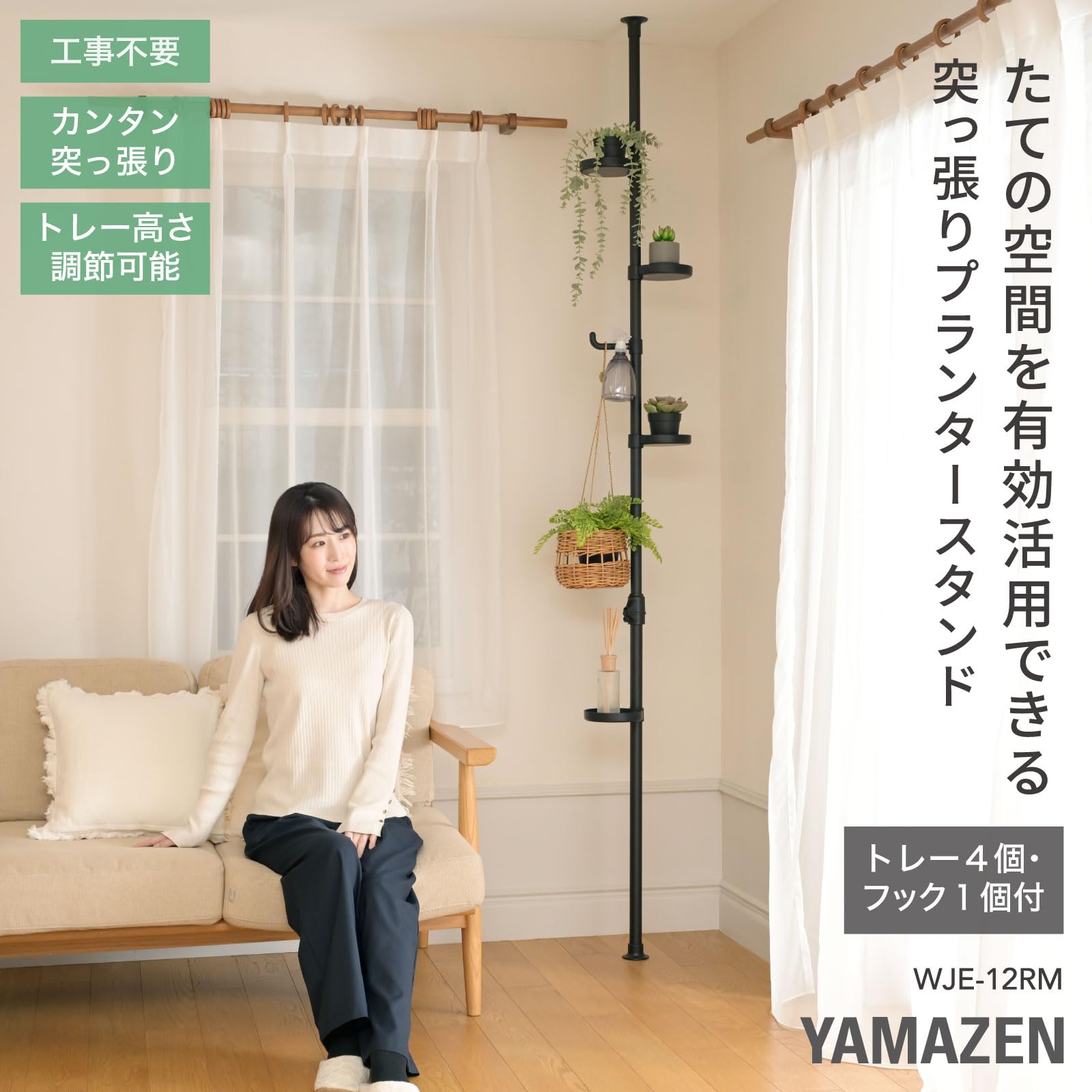 【数量限】山善(YAMAZEN) 突っ張り ラック ポールハンガー プランタースタンド 設置簡単 (トレー4個・フック1個付き) ワンタッチ突っ張り (実用新案取得済) 幅30×奥行30×高さ190-260cm フラワースタンド ボタニカル 室内 組立品 マットブラック WJE-12RM(MBK) | GIGATERA