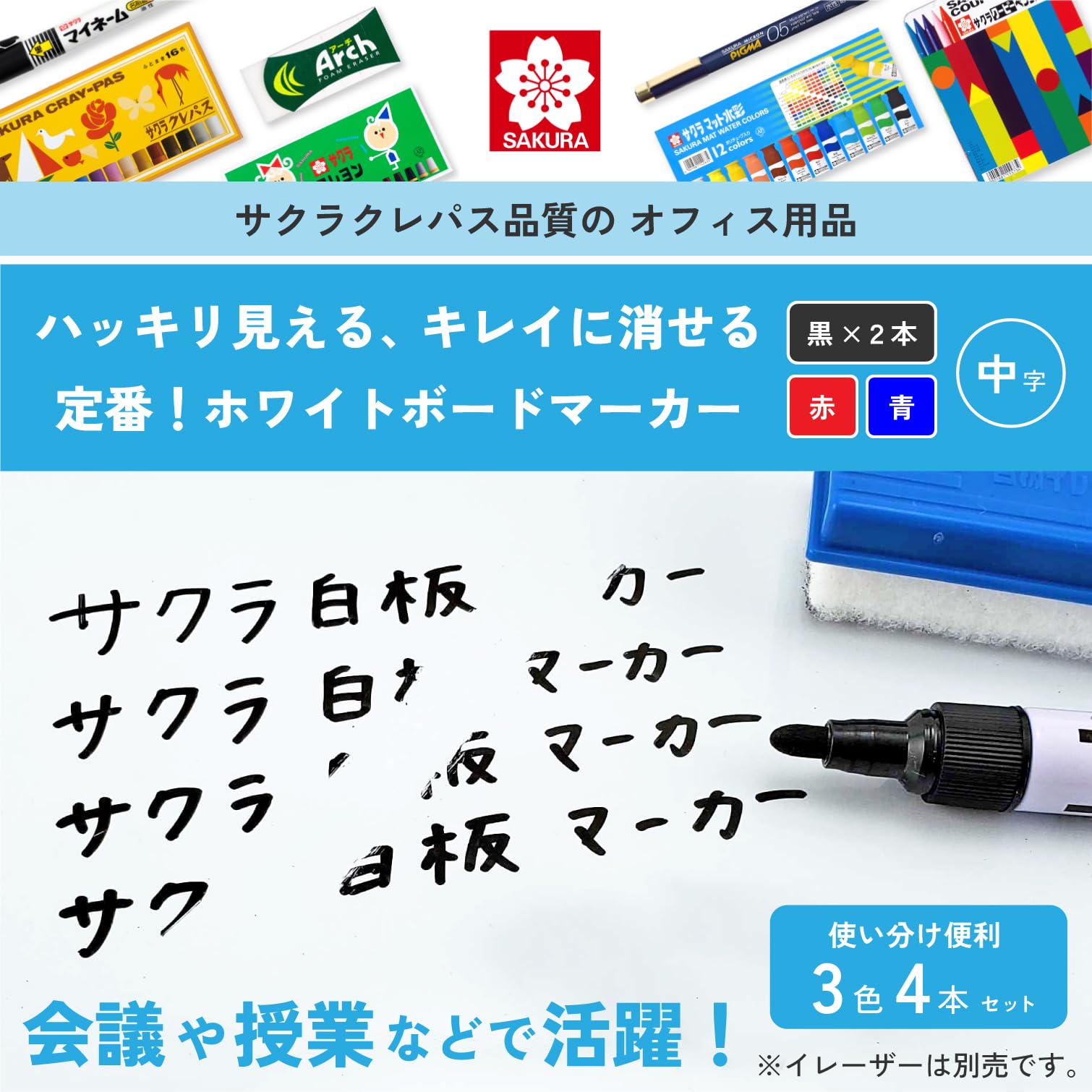 サクラクレパス ホワイトボードマーカー 中字 3色4本セット(黒2本/赤・青1本) WBK-4B-P