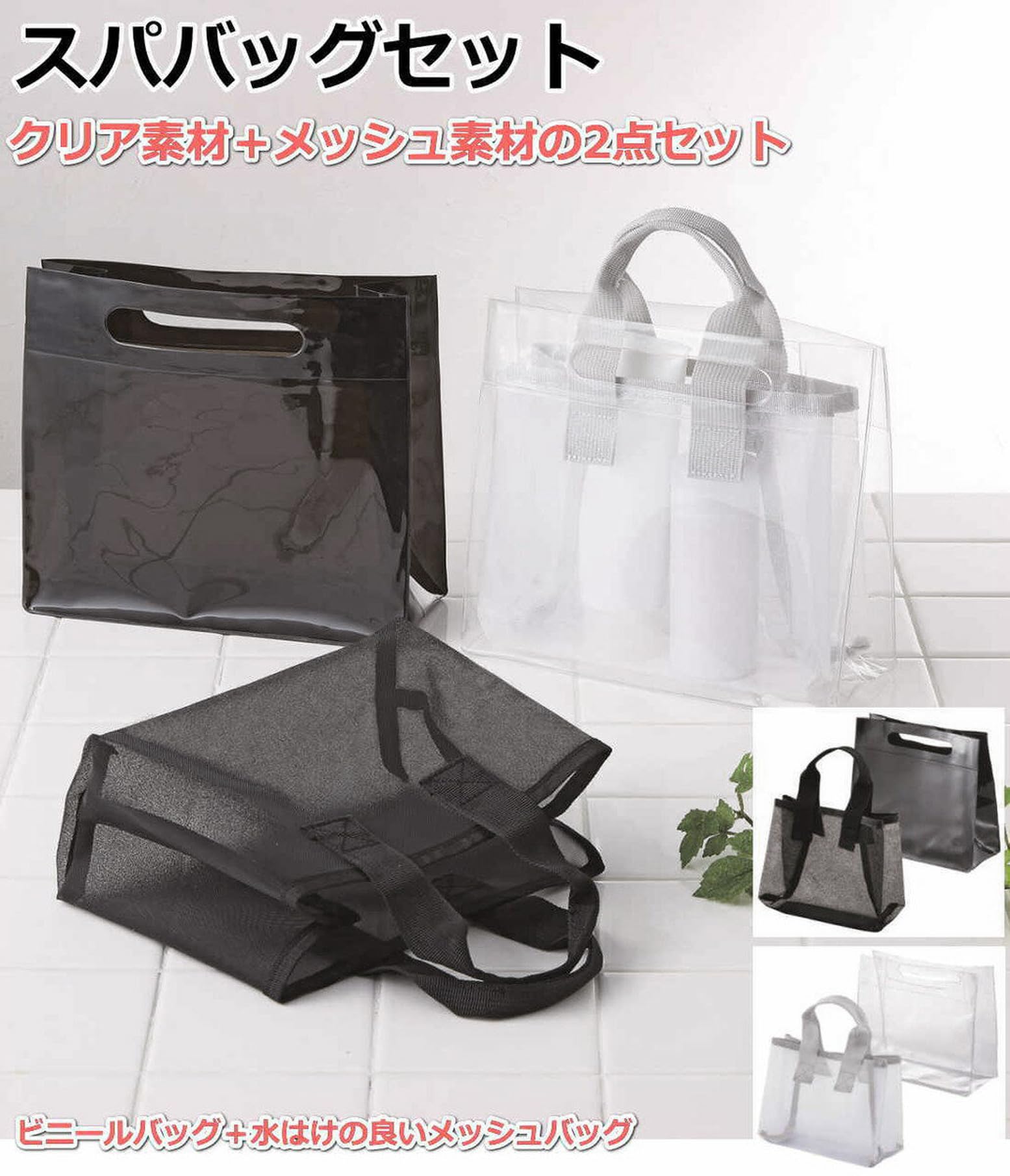 クリアビニール と メッシュの 2つの バッグ を重ねて使える水に強いスタイリッシュなデザインのビニールバッグ。 重ねて ・ メッシュ単品 ・ ビニールバッグ 単品 の3WAY! スパバッグ としてはもちろん、 旅行 や ジム のお供にもオススメです