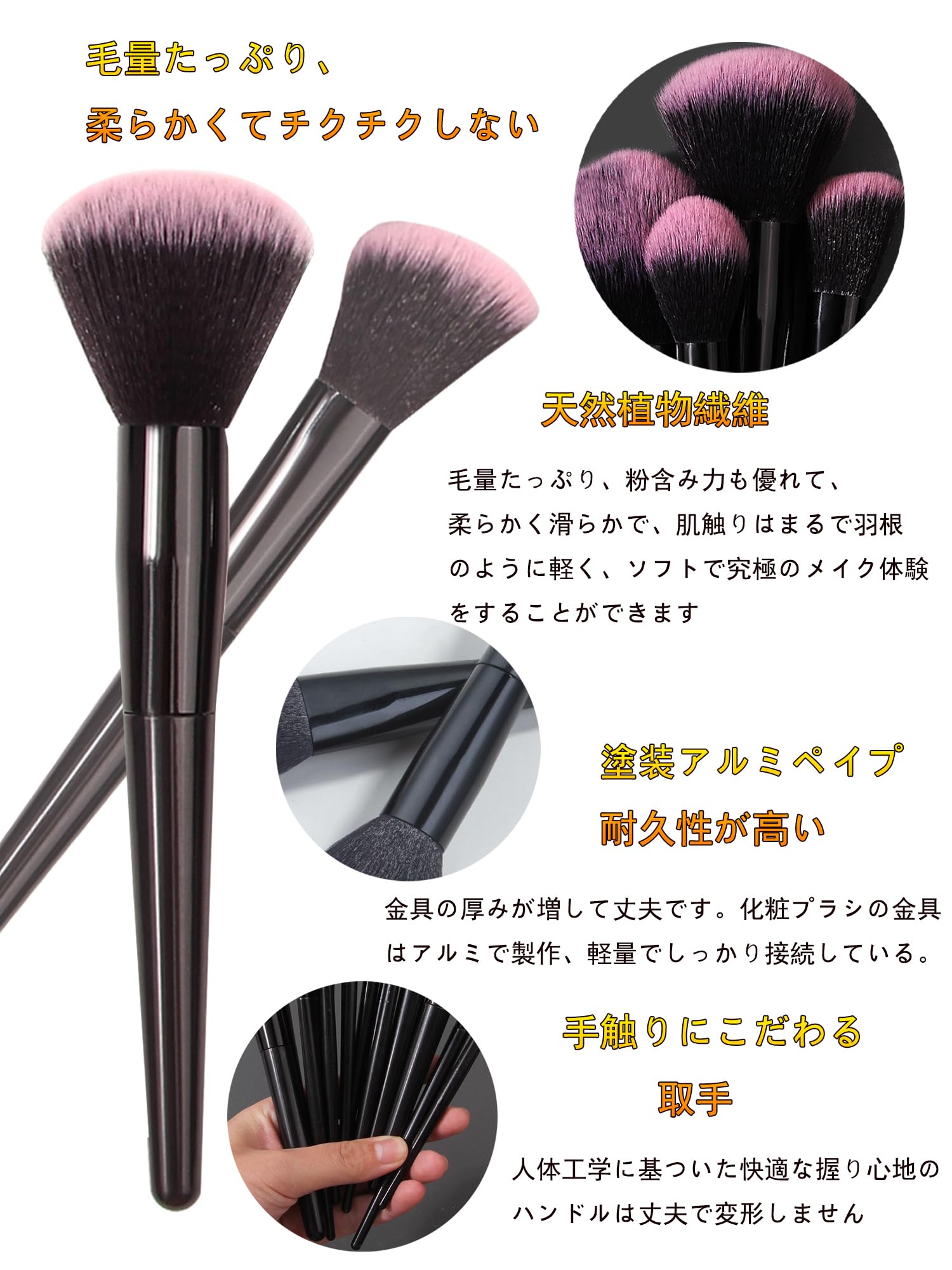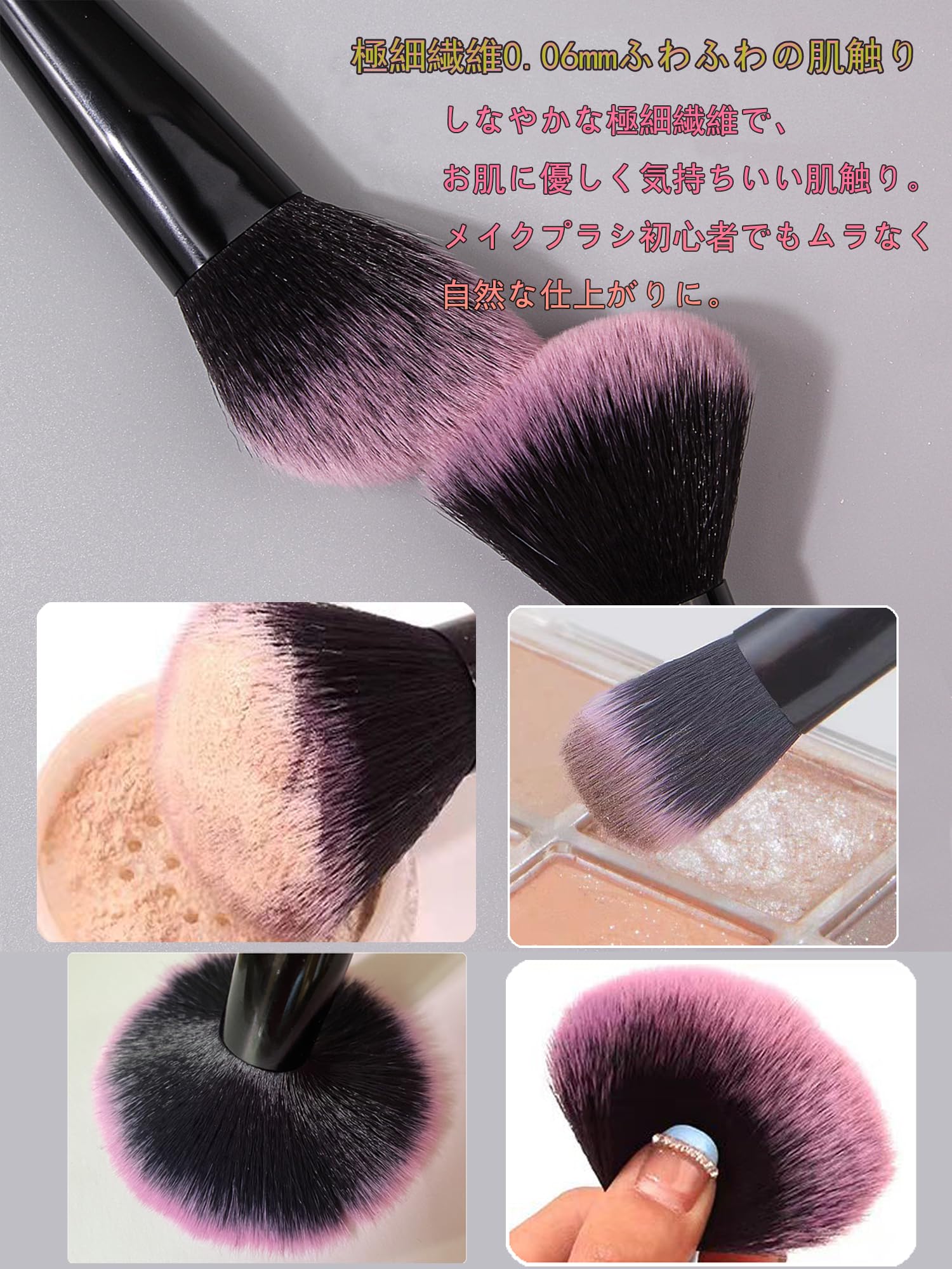 【上質素材で化粧ブラシ、敏感肌に優しい】ブラシの毛は高品質な繊維毛を厳選し、使い心地が非常に柔らかく、また毛が密集していて粉含み力が抜群。柔らかく、弾力性に富んで、肌を刺激しません。敏感肌の方も気軽にご利用頂けます。