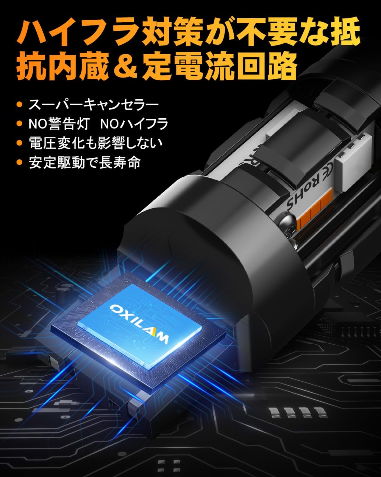 【抵抗内蔵】通常LEDは純正球よりも消費電力が低いため、玉切れを起こしたと認識し誤作動を起こしてしまい異常状態になり、別途抵抗を付ける必要がありますが、OXILAM T20 LEDウインカーは小型の抵抗をバルブ内に内蔵しているので面倒な加工は必要がございません。ハイフラ対策必要ございません。されに定電流回路内蔵により、車両特性による突発的な過電流の影響を受けず、安定した点灯を持続できます。優れた安定性と長寿命を実現!