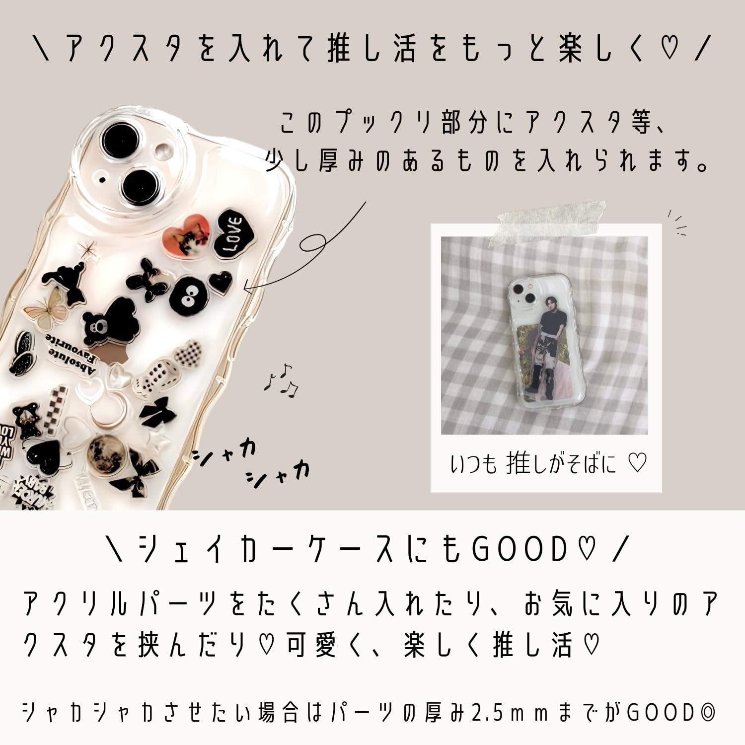 ??【推し活にぴったり!シェイカーケース対応】 本製品の特性上、背面部分に空洞があるため、少し厚みのあるアクリルスタンドが挟めます! シャカシャカパーツ、ガチャ、ぷっくりシール等々・・・あなたの”好き”を収納!流行りの推し活カスタマイズも楽しめる??