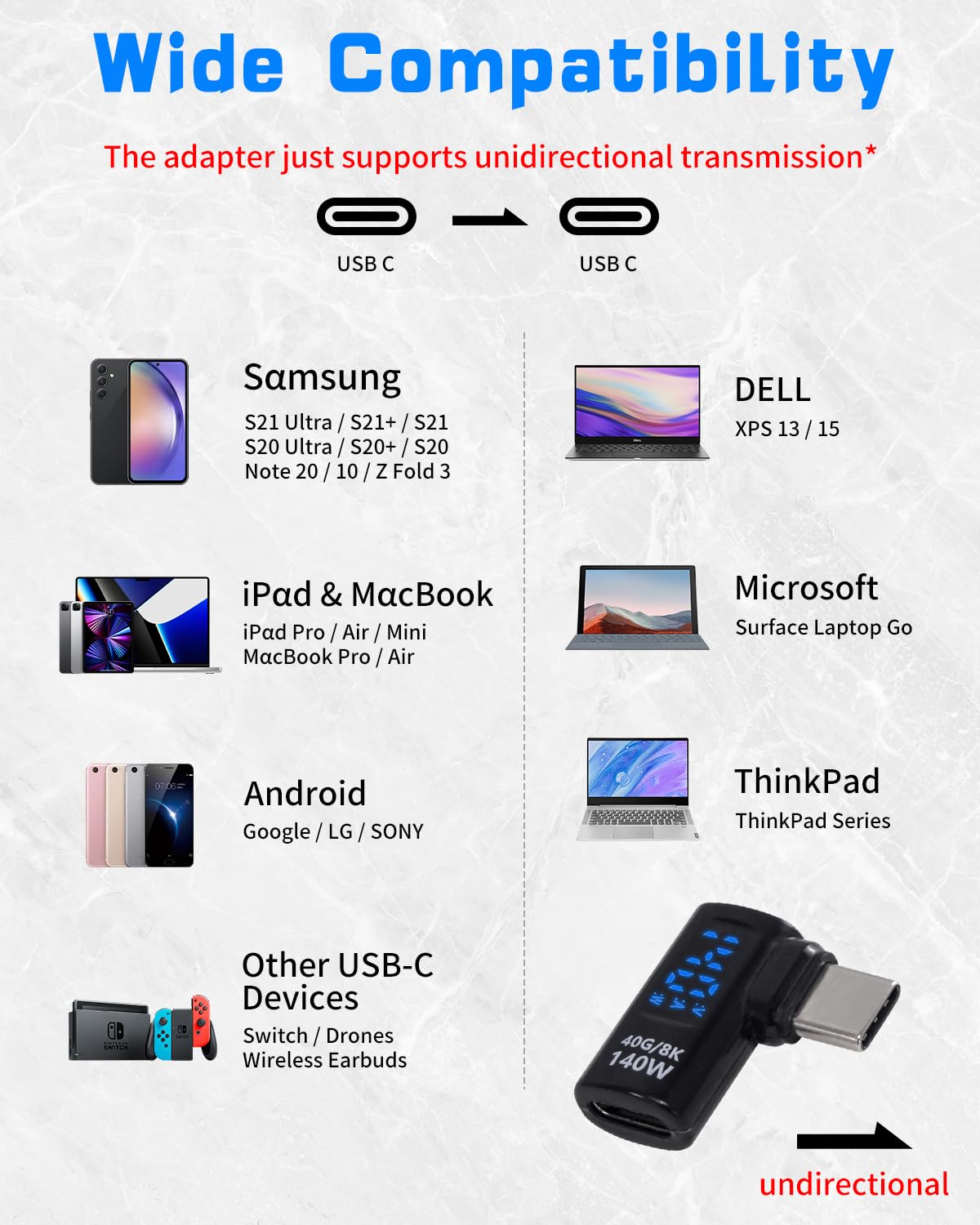 【140W PD急速充電 & 40Gbpsデータ転送】USB C 延長アダプタは最大140W(28V/5A)のPD充電が可能です。同時に、このUSB C延長コネクタはUSB 4規格に準拠し、40Gbpsデータ転送をサポートします。