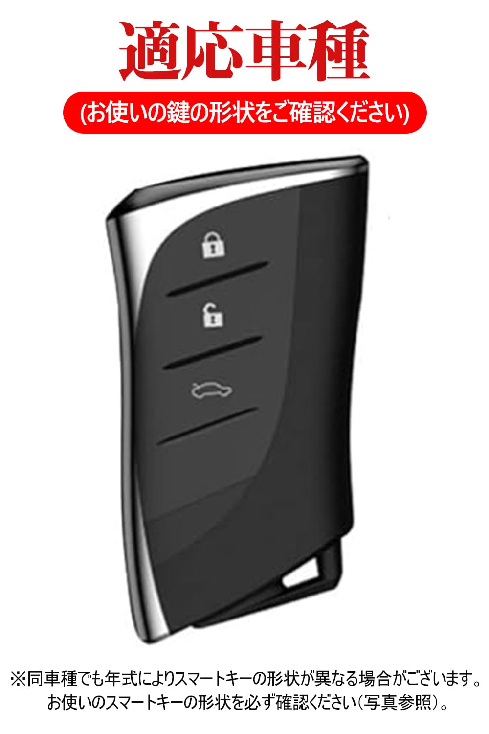 適応車種:このレクサス用キーカバーは UX 2018年〜: UX250h ( MZAH10 MZAH15 )/ UX200 ( MZAA10) 、 新型 NX 2021年10月7日〜:NX250 NX350 NX350h NX450h+ F SPORT / version L 、 ES 2018年〜: ES300h ( AXZH10 ) F SPORT / version L 、 LC 100系 2018年〜: LC500h ( GWZ100 )/ LC500 ( URZ100 ) , LS 50系 2018年〜: LS500h ( GVF50 GVF55 )/ LS500 ( VXFA50 VXFA55 ) F SPORT / version L / version C等 ※年式により異なる場合がありますので、画像のキーの形状をご確認下さい。画像のキーの形であれば適合です。ご不安な場合は、お気軽にお問合せ下さい。