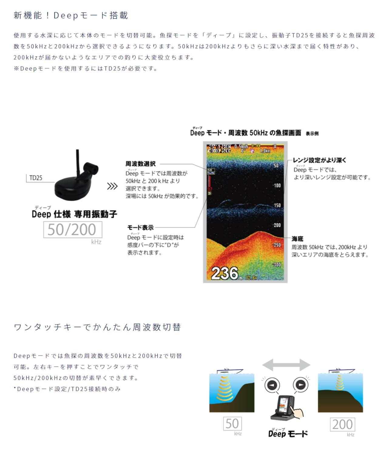 Deep モード搭載【Deep モードを使用するには振動子TD25 の取り付けが必要です/最大水深500mまで水深表示が可能】