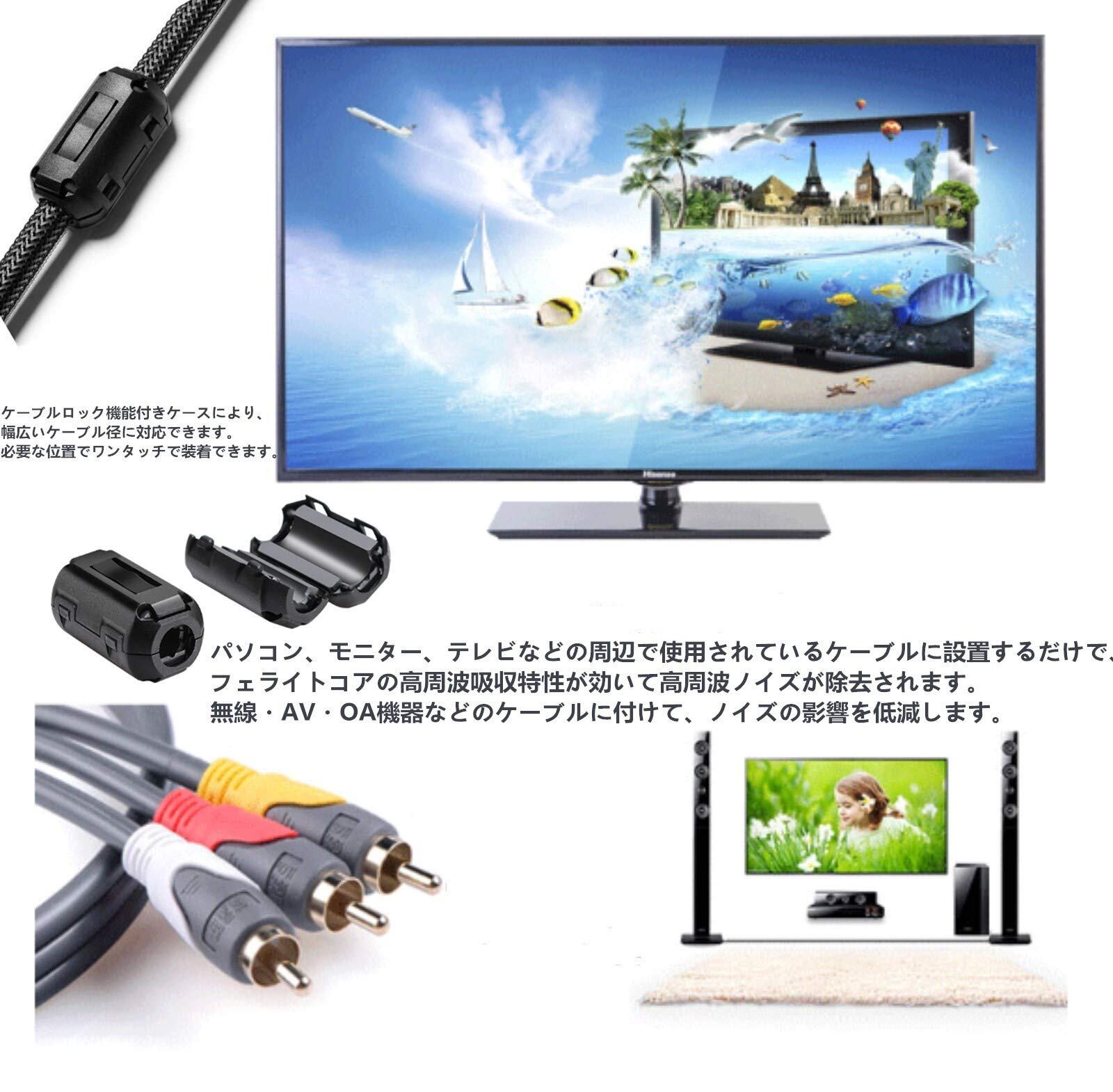 【ノイズ除去】パソコン、モニター、テレビなどの周辺で使用されているケーブルに設置するだけで、フェライトコアの高周波吸収特性が効いて高周波ノイズが除去されます。電磁放射をより効果的に抑制するために、干渉源の近くに設置してください。