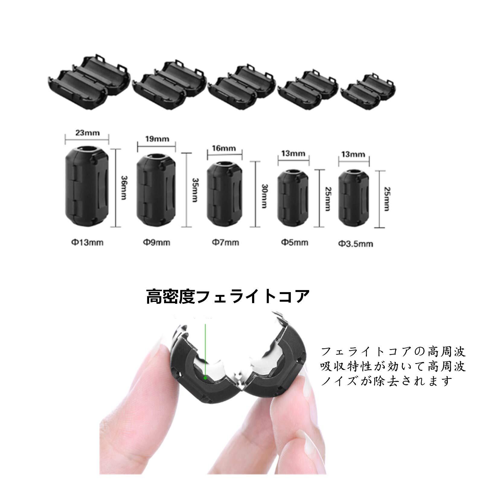フェライトコア 内径Φ3.5mm, Φ5mm, Φ7mm, Φ9mm,Φ13mm 20個 セット ブラック 電源線 高周波 ノイズフィルター パッチンコア ブラック ヒンジ式