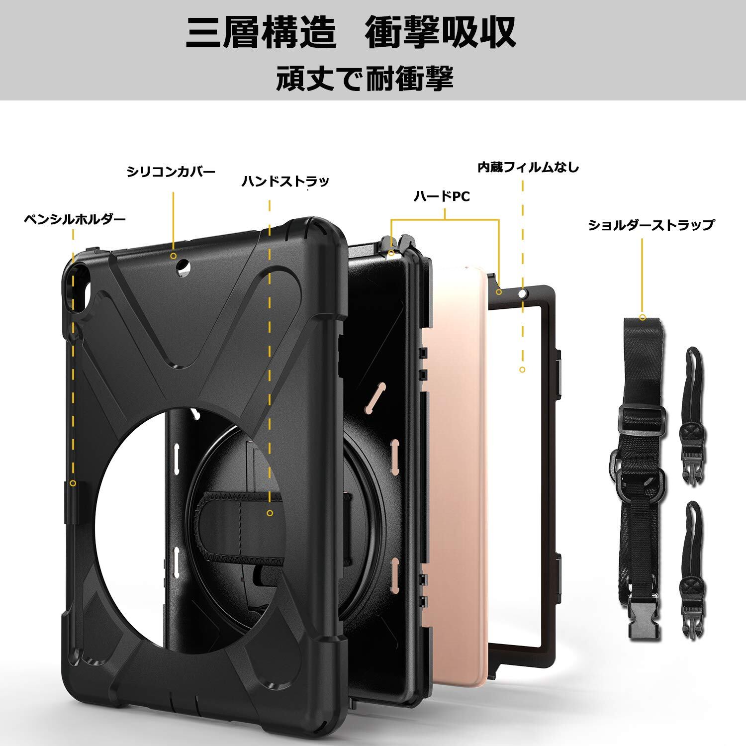 iPad Air3 ケース 2019 耐衝撃/iPad Pro 10.5 2017 ショルダー Herize ペンホルダー ペンシル収納 360度回転 耐衝撃 縦置き 横置き 頑丈 傷防止 ハンドホルダー スタンド 防塵 肩掛け ストラップ 丈夫 ハード iPad 10.5 ケース ブラック