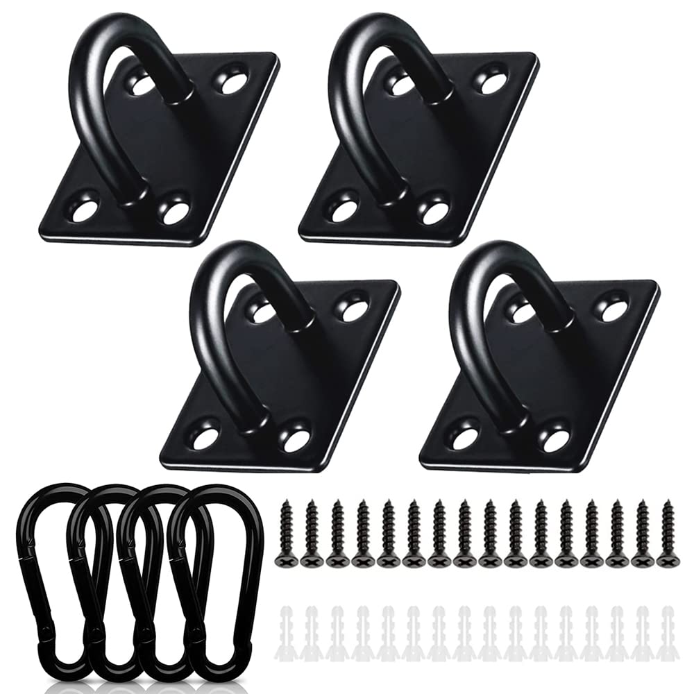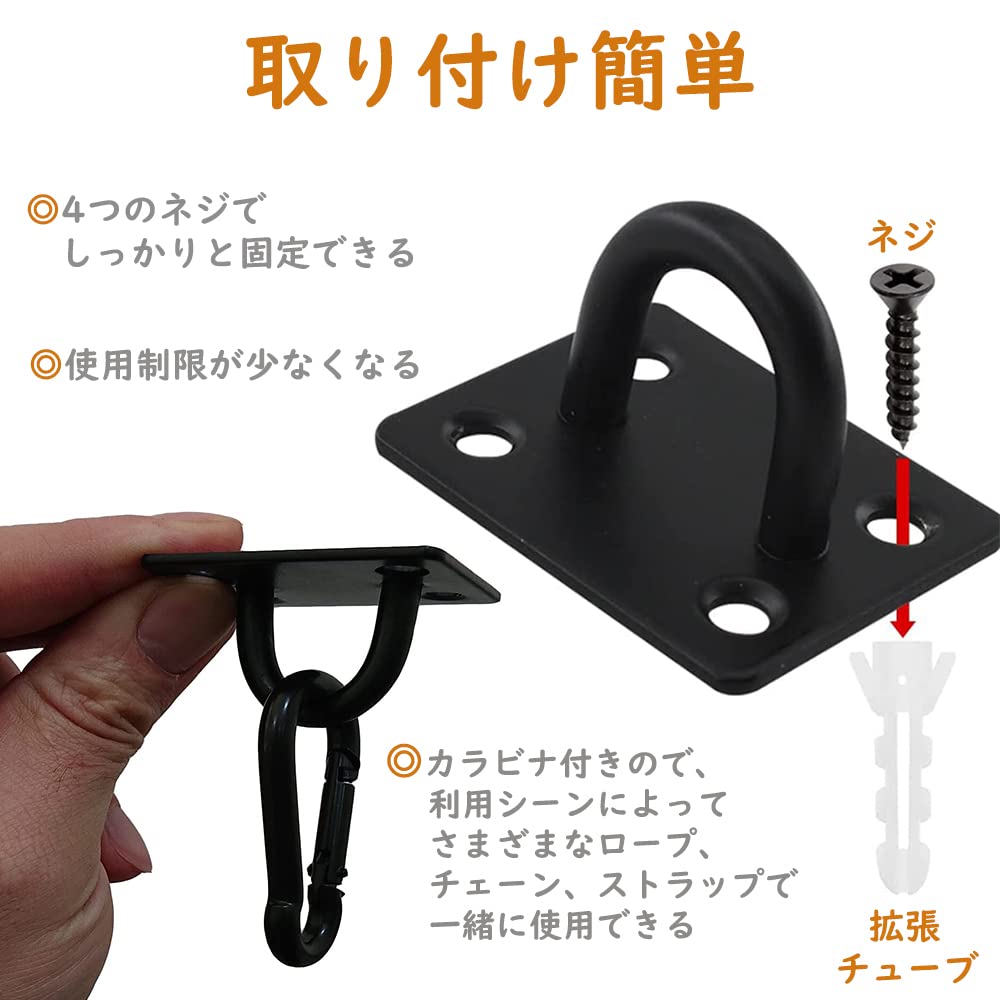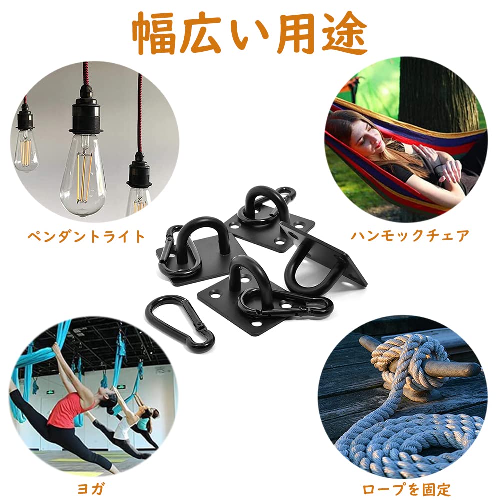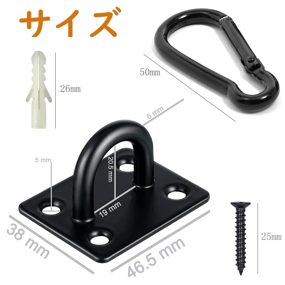 天井 フック アイプレート 吊り下げ金具 長方形プレートフック U型 ステンレス 黒 日よけ金具 壁 サンシェード取付用 耐腐食性 固定 止め金具 高強度 4個セット カラビナ/ネジ/プラスチック拡張チューブ付き